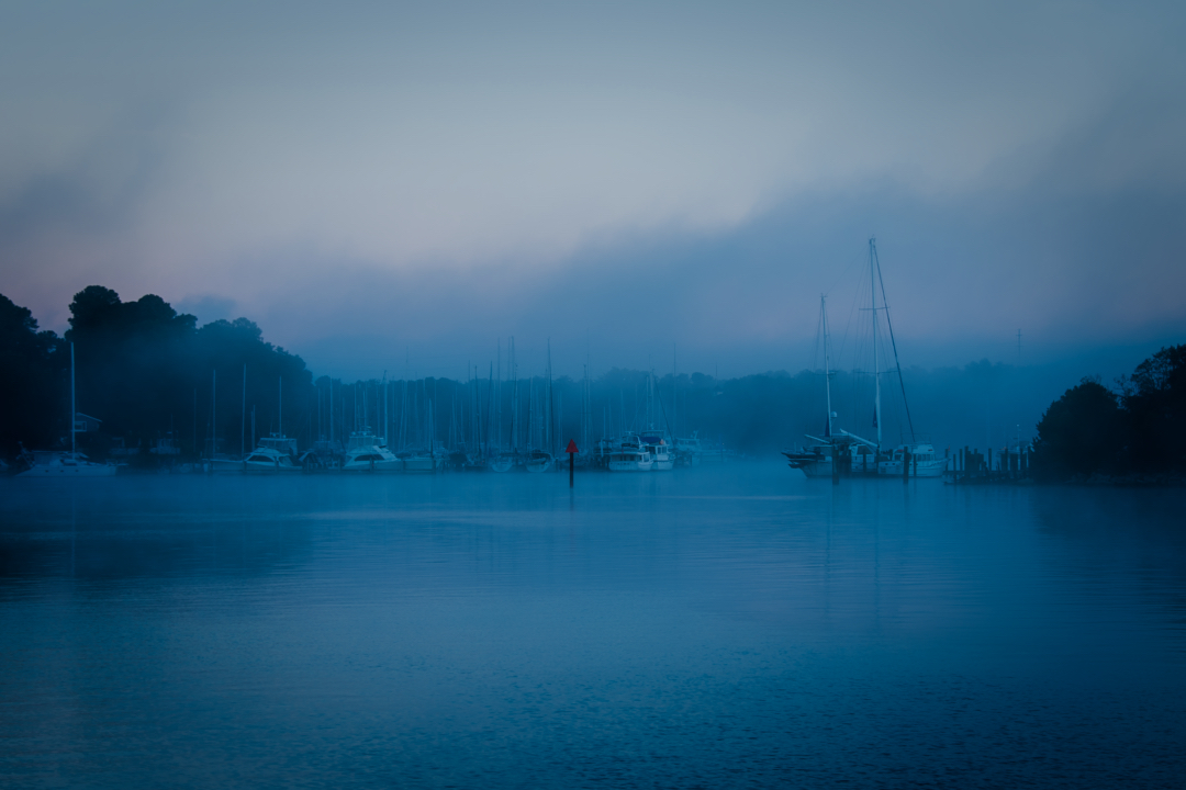 Waking early and going up top to put together a cup of coffee, I take a look out the window and see the winds have indeed stopped blowing. The cool temp and warm water has coalesced to paint this image of a foggy morning inside Solomons Island Harbor.