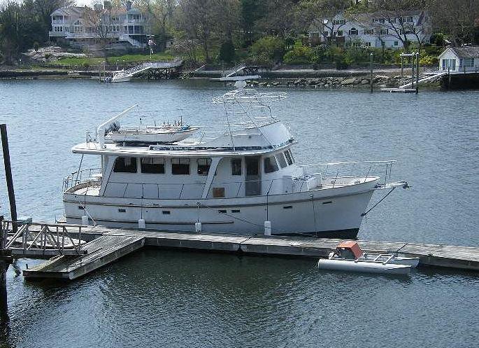 Its design is somewhat unique in that the helm station is on the main level of the boat, along with the galley and main saloon.  The lower level has an aft master stateroom with head, a walk-in engine room next forward, and then two staterooms with one shared head.   The forward stateroom originally had two single berths.  At some point, this was modified to a queen sized berth and both staterooms now have private heads with showers.