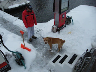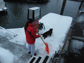 Ruby started up the dock to the ramp. Pam told her to stop and use the dock where she shoveled off the ice.
