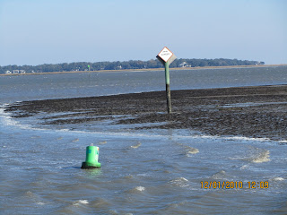 We passed through Hell Gate at low tide. Normally this is passable for us but strong westerly winds compounded the already shallow situation by blowing more water out of the narrow channel. My stomach starts doing flip flops when the depth sounder sounds 7′ (we draw 4’10”). I had to turn my back when we passed, I mean “plowed” through the mud at Hell Gate. The last time I looked at the depth sounder it showed 4.3′. You can see the shoal marker on land; the green navigation aid stays to the your left, the red on to your right.