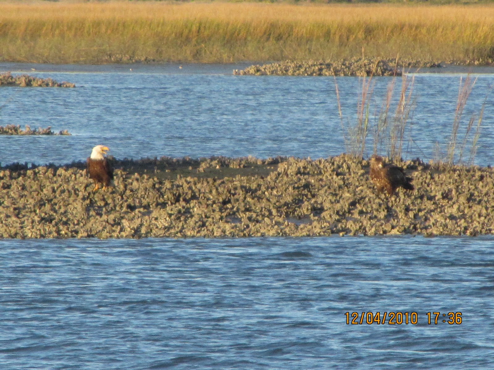 We anchored at Pine Island enroute to St Augustine. We spotted an adult eagle and what we think was a younger eagle on the shoal at high tide.