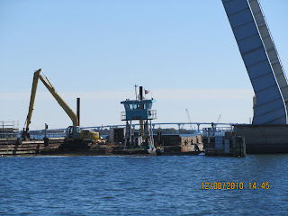 There’s also a NASA railroad bridge going out to the Kennedy Space Center that is normally open (unless a train is coming). As we approached it we noted a barge and a tug were blocking our passage. As it turns out, the barge was unloading rocks to fill the inside of the breakwater formed around the inside of the RR bridge.