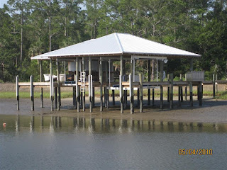 The farther north we have traveled, the greater the tidal change has been. It was about 5-6 feet in St. Augustine, and was 7-9 feet at FernandinaBeach. The docks lining this ten-mile, no wake canal near PalmValley were evidence of the huge shift between high and low tides. We were passing these docks at near low tide, and noticed that some folks had rather ingenious dock designs.