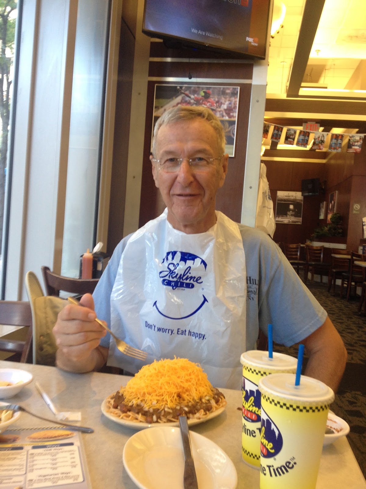 This was our first visit to Cincinnati and our first taste of Cincinnati Chili at the famous Skyline Chili in downtown. Call me a skeptic but cinnamon in chili? It was absolutely outstanding! Our server said she puts bibs on all first-timers.  The manager, cook, and server treated us like royalty.  We had the 5 Way Chili—-spaghetti, watery/runny chili, beans, onions, and about 5 pounds of cheese on top.  The cook emerged from his cocina and said he saw us trying to twirl but said, “that spaghetti is all cut up.  You can’t twirl Cincinnati Chili” and they all laughed.  That was really a fun experience—gastronomically speaking as well as entertaining.