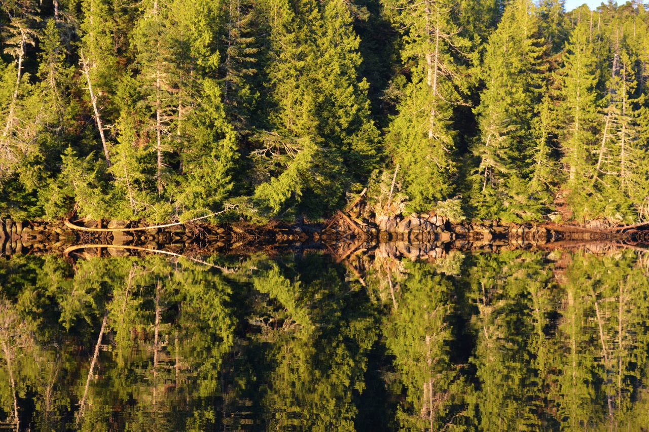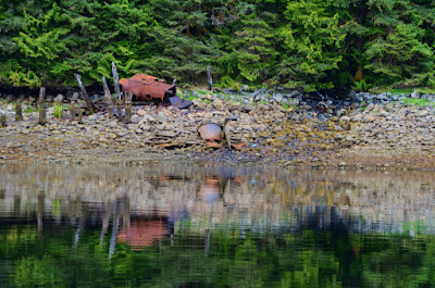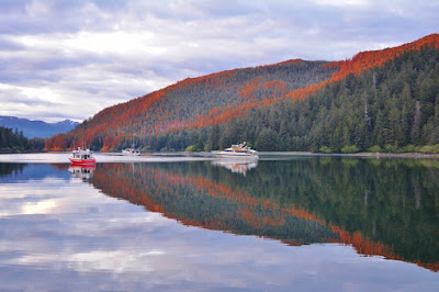 Our anchorage for the evening is Lowe Inlet, just 15 miles up the Grenville Channel, just before the narrow portion, only 1/4 mile wide. Lowe Inlet is a marine park and we usually anchor in Nettle Basin, which is mostly 80-100 feet deep, right in front of Verney Falls. The flow from the falls keeps the boat aligned with the current rather than swinging all night. That was the plan, but the National Geographic Quest was anchored in Nettle Basin. We negotiated an anchorage location and one hour later the Quest left us alone except for “Yachette”. With sunny weather and 70 degree temperatures it was a pleasant evening in Lowe Basin.