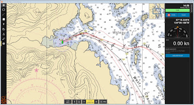 Our alarm was set for 0500 for a 0535 departure from North Island Marina, not even fully light. The winds were calm with light rain, which persisted until noon. We set a course across Neill Ledge, through a 40 feet deep gap between the kelp patches and headed for Pulteney Point. From Pulteney Point we headed for Gordon Channel, boosted by a modest ebb current.