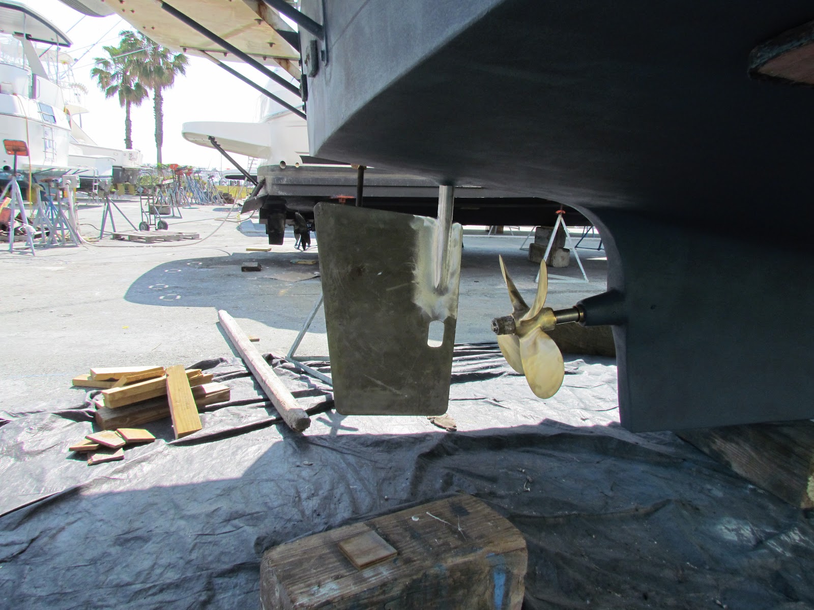 April 14,2012 – Finally all of our parts (prop,shaft,rudder,rudder bracket) came back this past week and the mechanics went to work promptly to reinstall all. The shaft turned out to be fine but the prop needed to be rebalanced,. The rudder, on the other hand, received the most damage. The rudder post was cracked and the bracket that connects it to the hydraulic system was cracked. The specialty shop had to fabricate a new post and bracket. All of that is what came back.