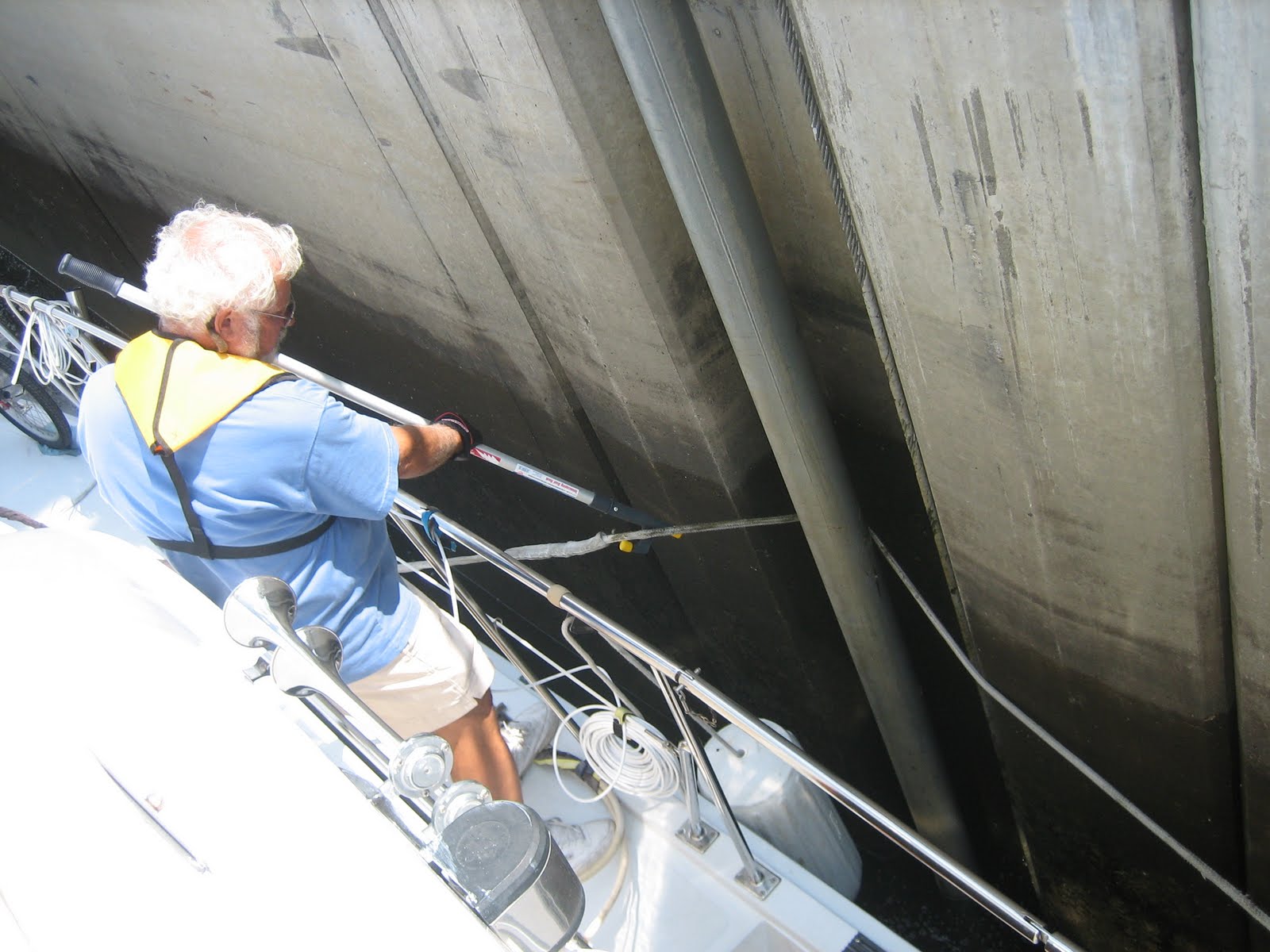 There are various methods used in locks to secure boats to the wall while being raised or lowered to a different water level. In the Troy Lock, Ken had to loop a line around a pipe and secure it to our boat. Then he had to make sure it didn’t get caught as the water level rose.