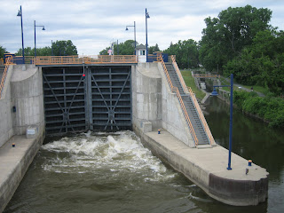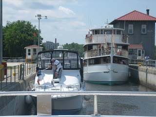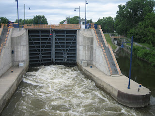 After the lock doors closed, we walked up the steps to watch the whole operation from above and to talk to the lockmaster about the various methods employed in this lock and others for securing boats. This made us feel more secure about the trip ahead of us on the Erie Canal.