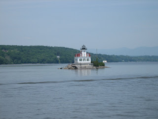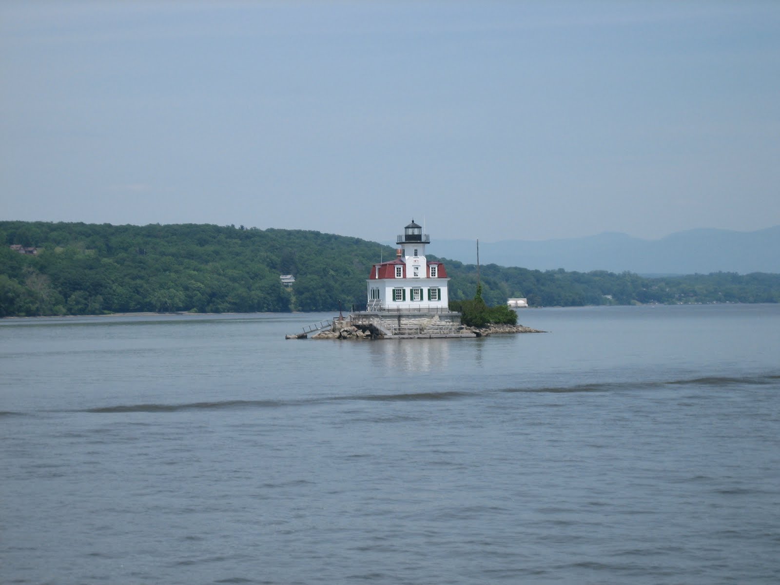 Our next cruising day was a long, hot one, with temperatures in the 90’s. Since we were going in the same direction as the breeze, we didn’t feel it at all. I sat at the helm with a bowl of ice water into which I dipped a cloth to mop my brow and hang around my neck to keep cool. Nonetheless, the scenery we passed was still beautiful and interesting, including this lighthouse, the first of several we were to see on the upper Hudson River guarding shoals or entrances to harbors.