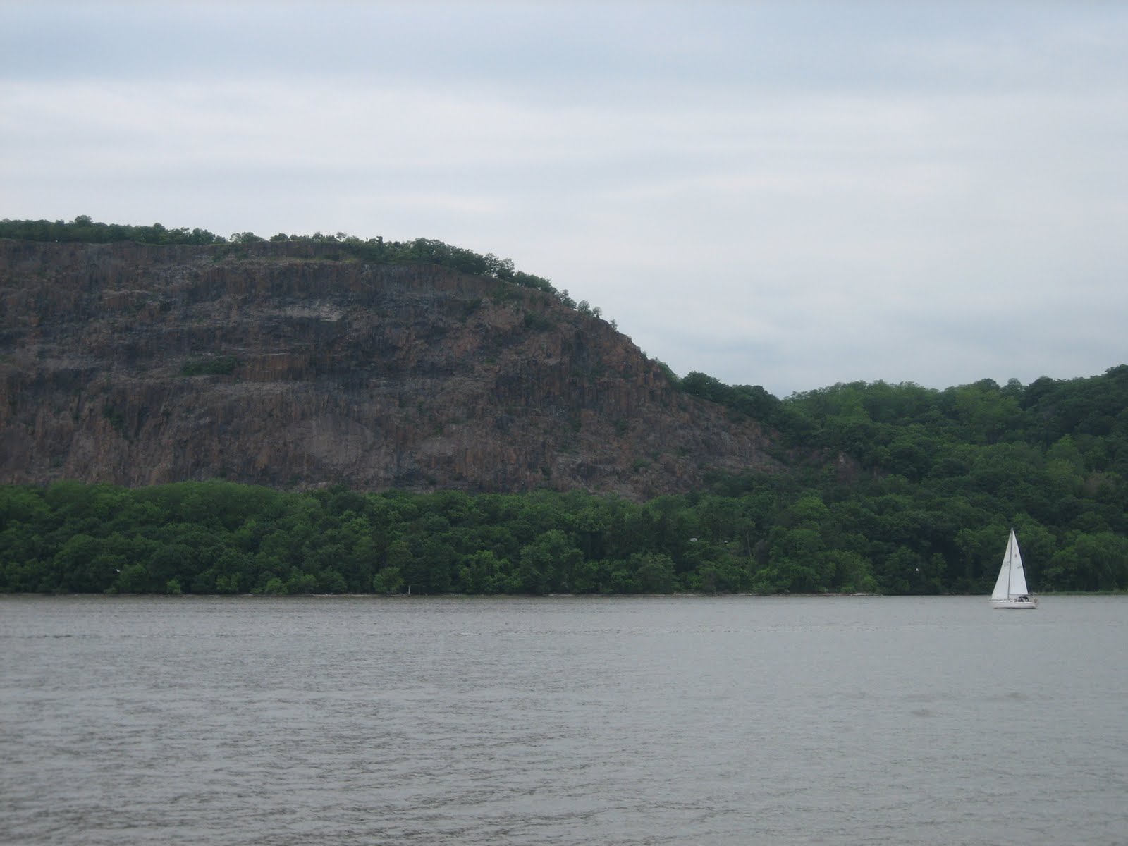 To give some perspective regarding the height of these cliffs (300-500 ft.), just look at how small a sailboat looks cruising on the Hudson next to them.