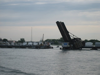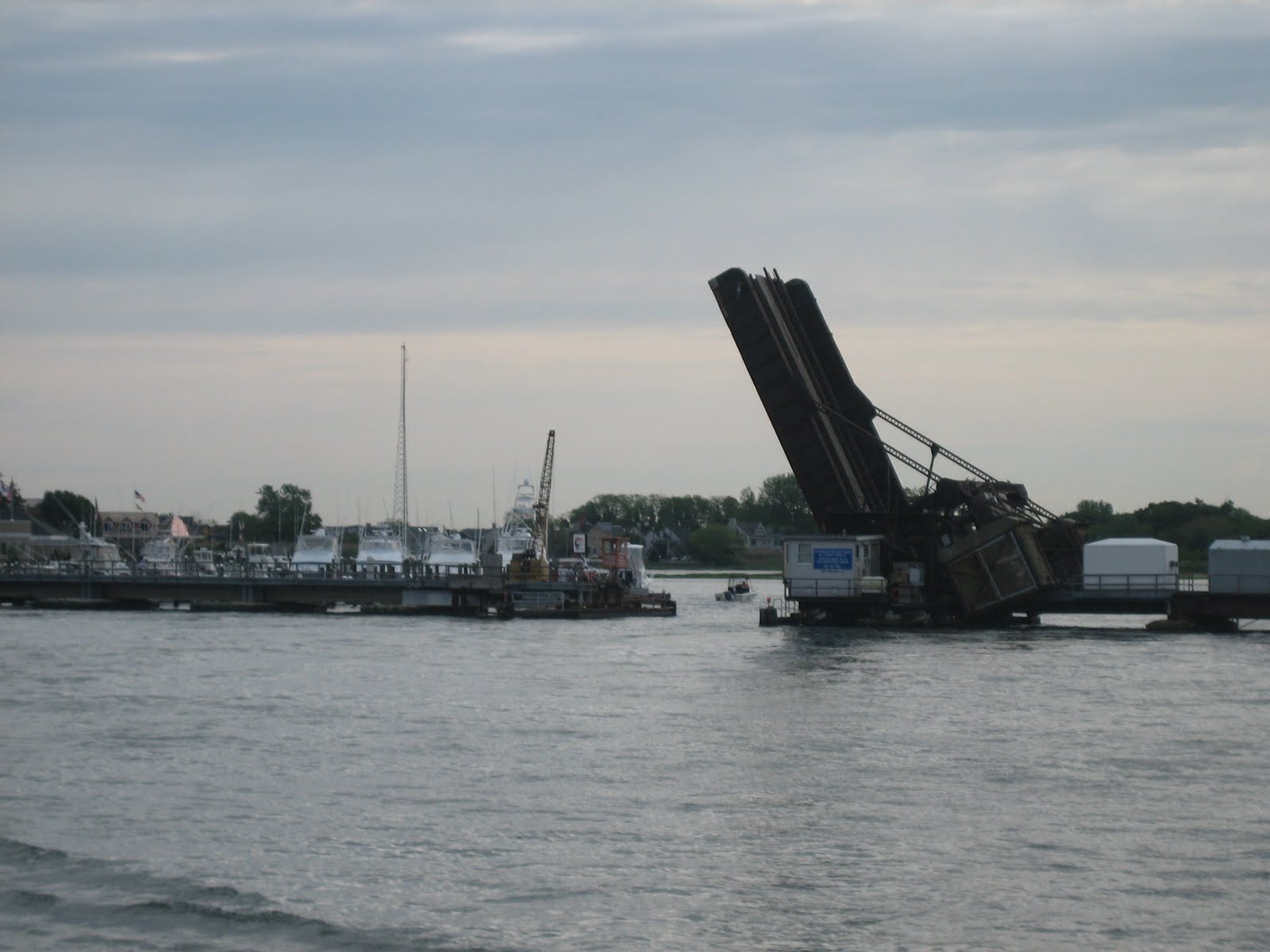 Then we emerged into the Manasquan River and cruised under the Route 35 bridge, heading for the next potentially tricky spot at a train bridge where only one vessel at a time can fit through the narrow opening. Since it was a Saturday, we thought there might be lots of boats possibly waiting for the bridge to open. Not so, no problem.