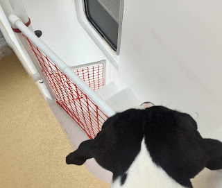 Her dad created a platform to assist getting the dogs from the boat to the fixed dock at various tides here in the Bahamas. Incorporated is a barrier to keep them from attempting a getaway – actually, to keep Dora from escaping.