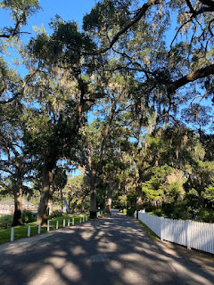 The streets are canopied by massive old oak and cedar trees covered in Spanish moss. Magnolias and palms are interspersed. It’s a beautiful walk. We see squirrels and Dee Dee’s nemesis, two black cats, and even an occasional deer.