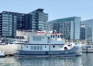 Red Head had to be towed from the haul-out well to the dock by a boatyard skiff – actually, two skiffs, one in front and one in back. While it was impressive to watch them get her underway, it was more impressive to watch them bring her up to the dock and stop her – with no damage to the people or the boat. A quick repair followed and she was ready to set off.