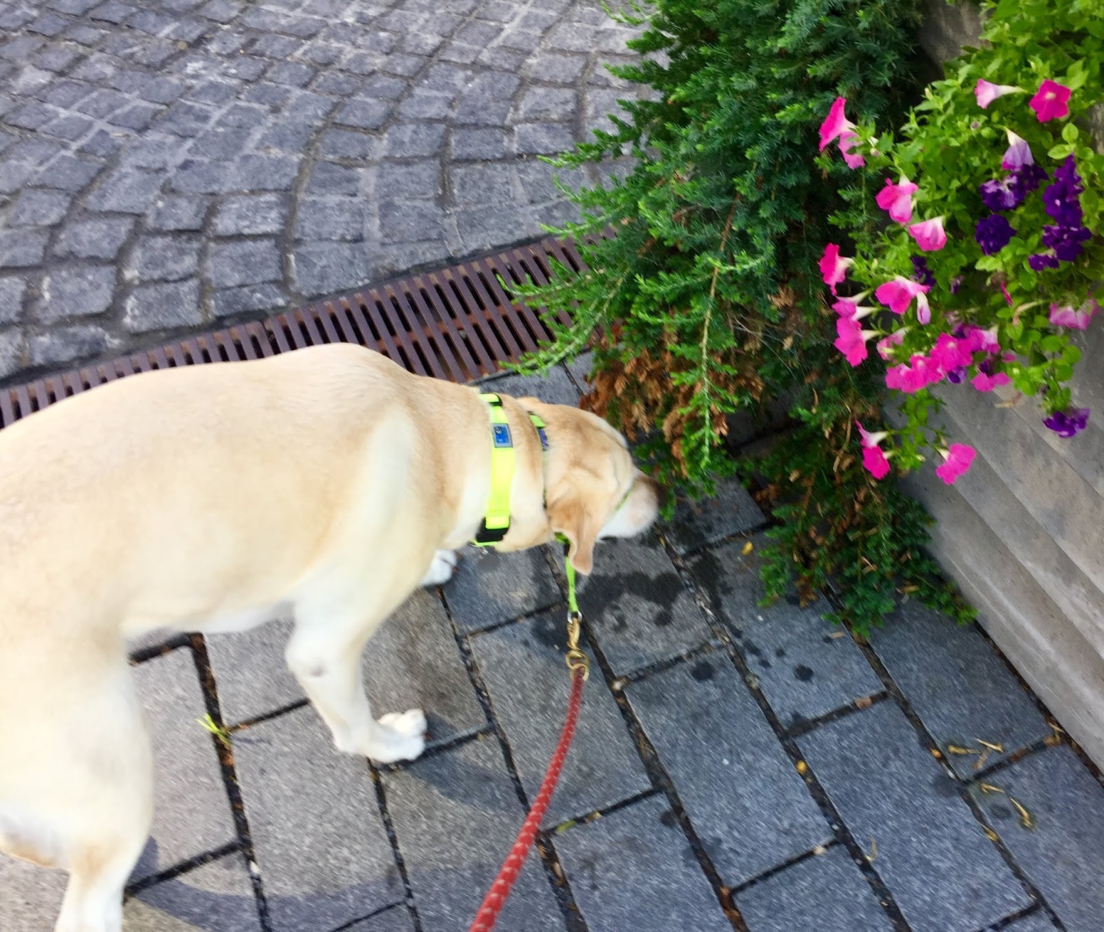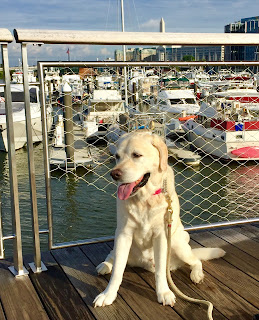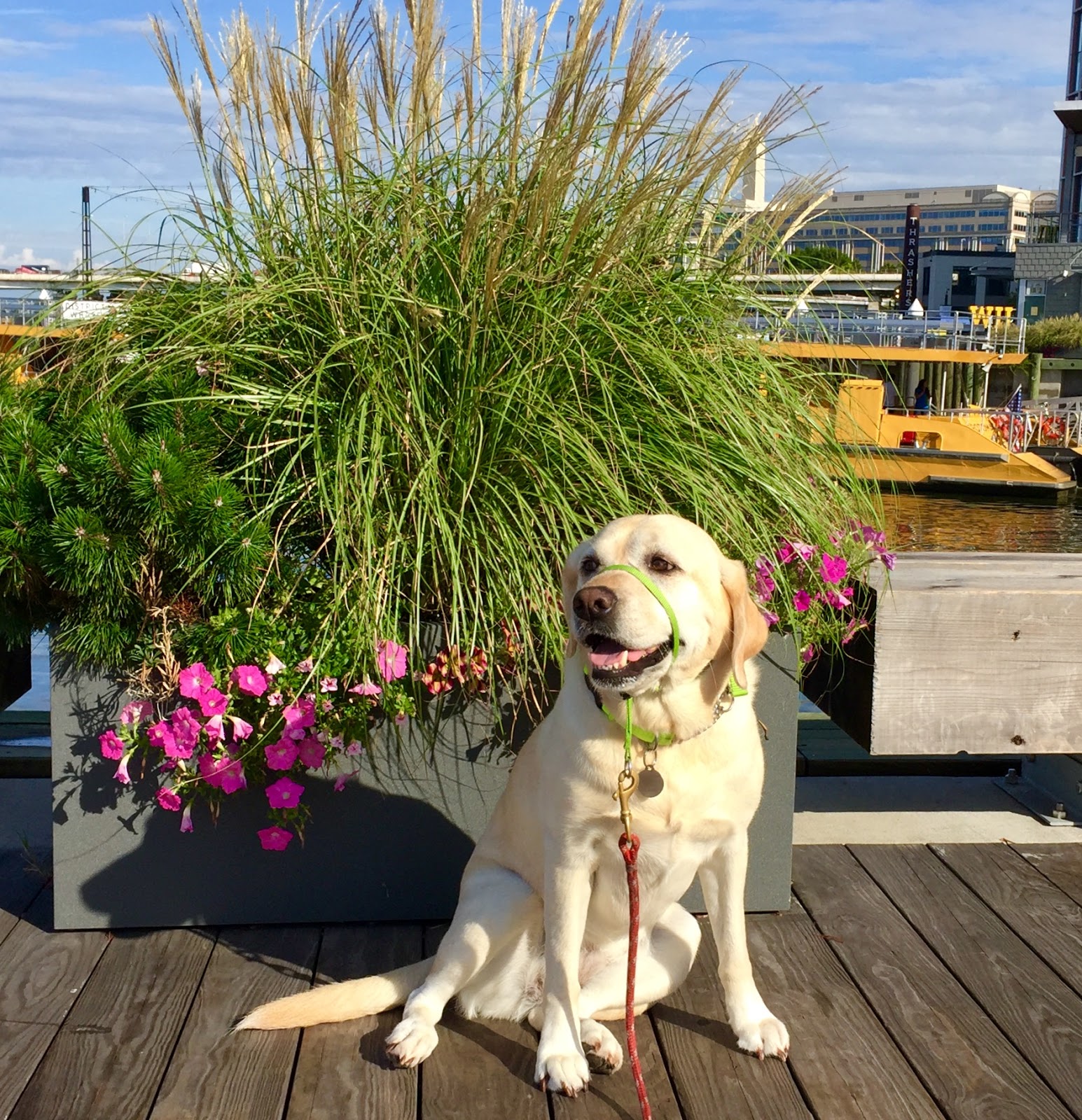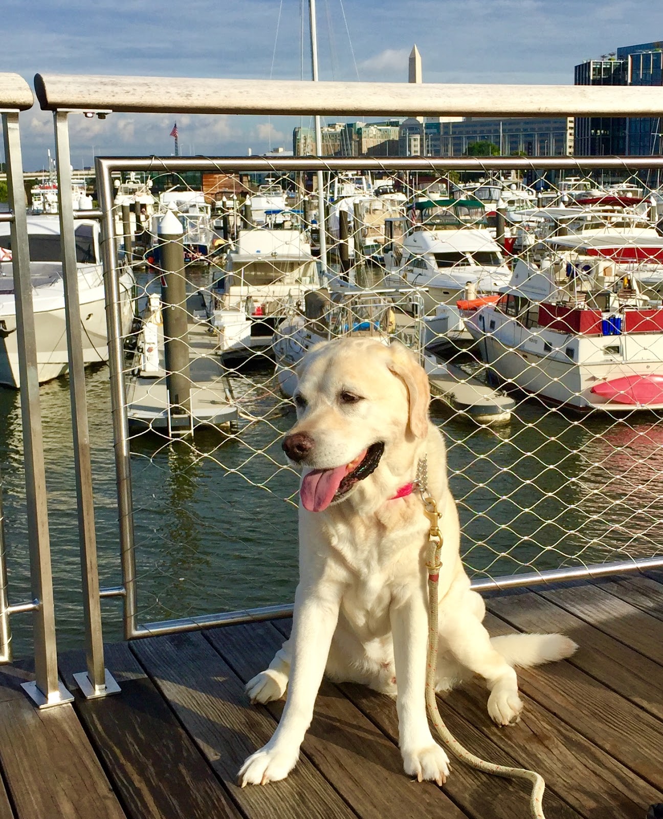 Mom heads out early before the heat really kicks in. First, she takes Dylan for a walk along the waterfront at The Wharf. There are long piers to visit, side streets to explore, and lots of people saying how cute he is. Note the Washington Monument in the background.