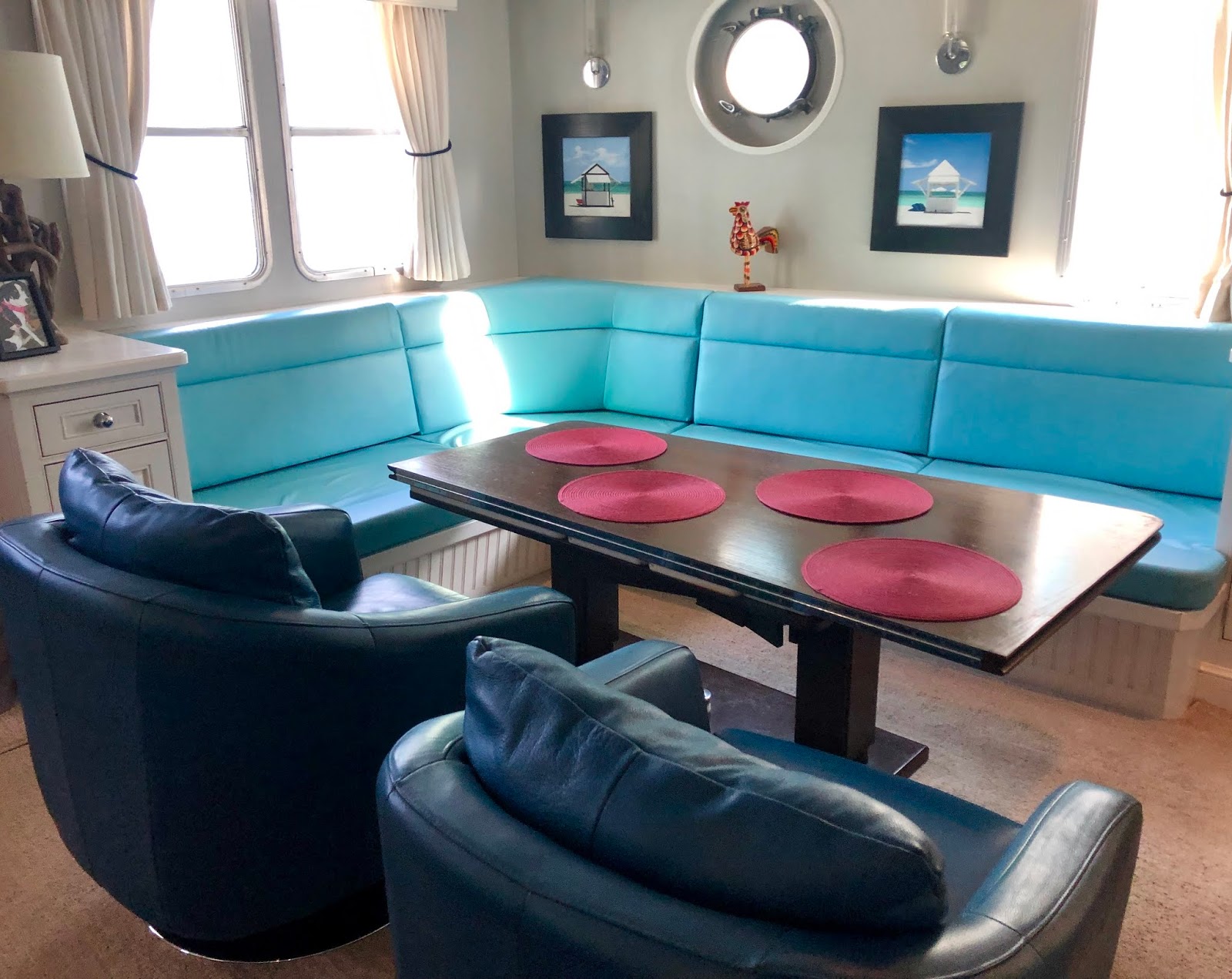 She quickly created a bottom cover using some outdoor canvas and well placed Velcro. Hopefully it’ll keep the settee “nice” for a little while. But honestly, a good crew beats a nice settee anytime.
