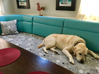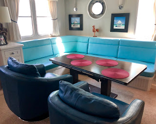 They had previously picked out some lovely vegan leather fabric for new settee cushion covers in the salon. The local canvas shop was able to fit in the job and the new cushions arrived last week. It was $$$ but everyone was pleased with the results.