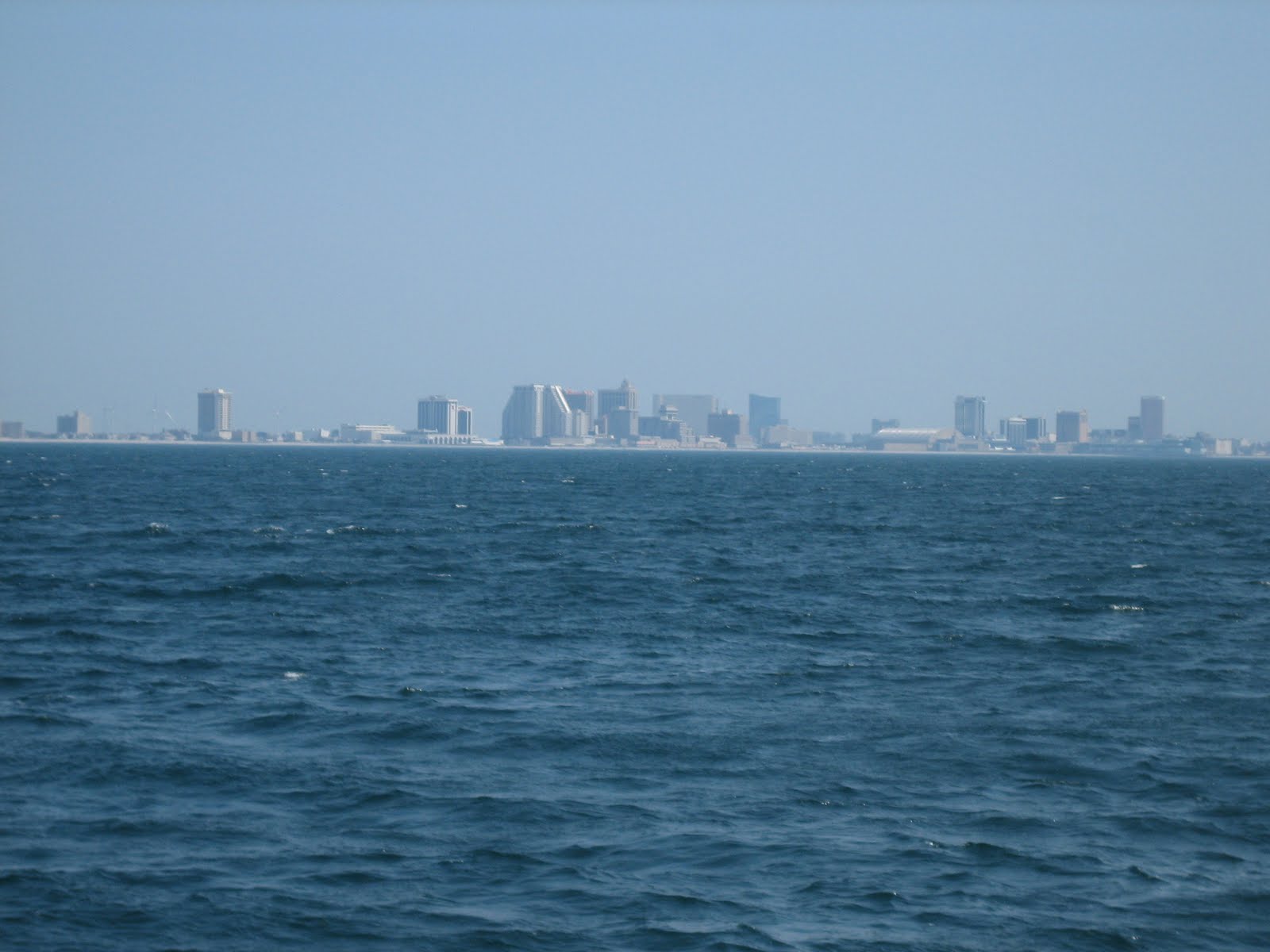 As the wind picked up a bit, light chop developed. Swells were a little more pronounced near each inlet we passed. By 9:30 it was sunny, and we could just make out a hazy outline of the highrises of Atlantic City in the distance.