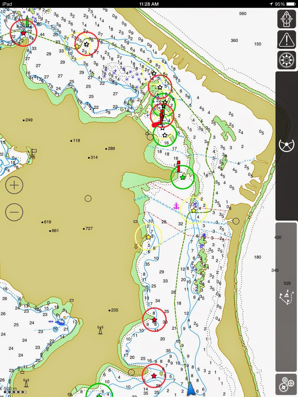| Matautu Bay. Our anchorage… in red, how to take the dink to shore, and snorkeling area |