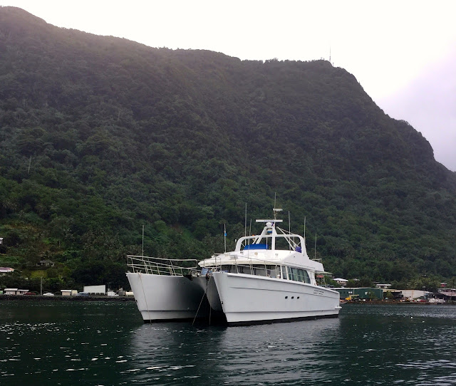 Apia Marina – The marina has been rebuilt after the 2009 tsunami and the 2011 hurricane, and it looks quite nice. At the time of our arrival there were 3 spots at the docks, including a large one for Domino, and all the pylon spots were free. According to Samoa Port Authority (SPA) all yachts are to dock at the marina. We were directed to drop anchor in the bay, though. Another problem: draft. The marina has a 2.2 to 2.4 meter limit. Sailing yacht Ariel IV was denied entrance due to their 2.6 meter draft. Of course, the Nordhavn 87 Zembra was on the hook as well. What should you do? Usually, cruisers inside the marina will scramble to find you help!