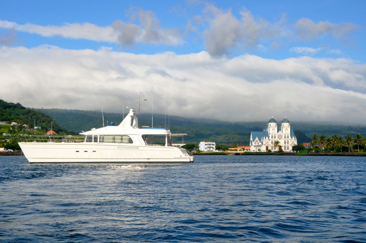 Apia Marina – The marina has been rebuilt after the 2009 tsunami and the 2011 hurricane, and it looks quite nice.  At the time of our arrival there were 3 spots at the docks, including a large one for Domino, and all the pylon spots were free.  According to Samoa Port Authority (SPA) all yachts are to dock at the marina.  We were directed to drop anchor in the bay, though.  Another problem: draft.  The marina has a 2.2 to 2.4 meter limit.  Sailing yacht Ariel IV was denied entrance due to their 2.6 meter draft.  Of course, the Nordhavn 87 Zembra was on the hook as well.  What should you do?  Usually, cruisers inside the marina will scramble to find you help!