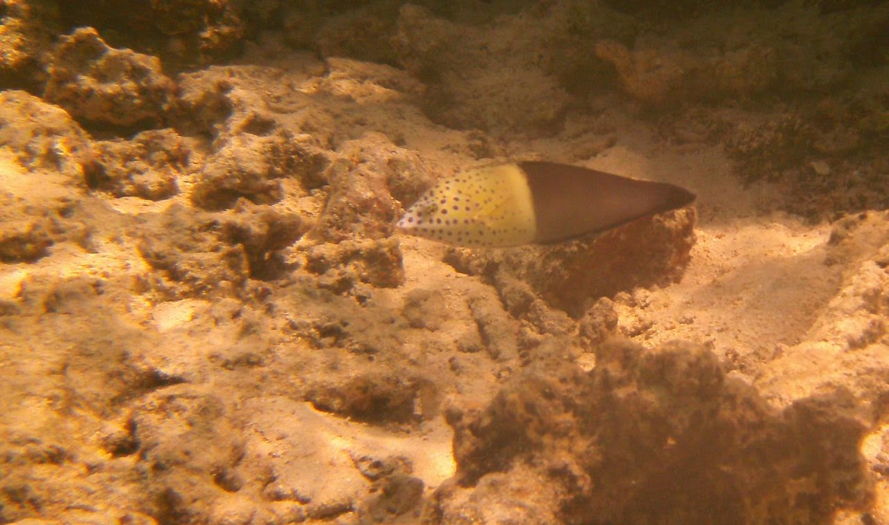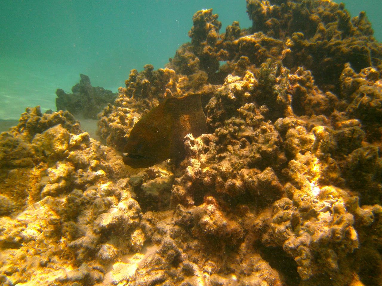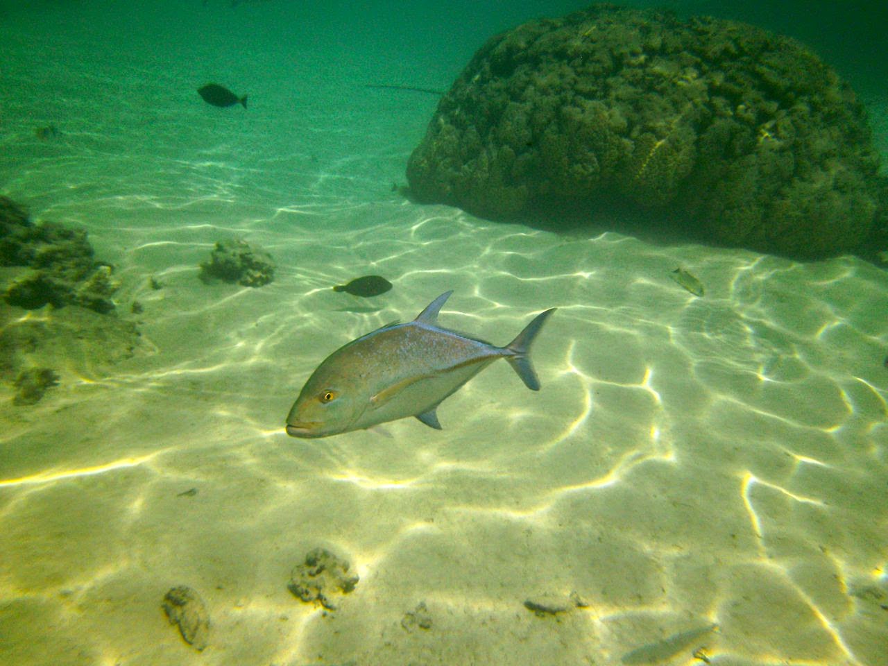 We came across a few beautiful “Feos,” scoured the reef for Ma’oas (sea snails,) surprised a few red-and-green octopus who fleeted between our feet, and did more cast-fishing from the reef ledge, tossing more fish back! At last, we found a few “bommies” (large coral columns) worth exploring: excellent variety of coral, teeming with multicolor lagoon fish, and surprised 2 very large nurse sharks that were basking in a quiet, super-warm, sandy pool. The trip was marred only by the sight of a rudder and its post resting on the “bommie,” reminder that we need to remain ever vigilant when navigating the lagoons.