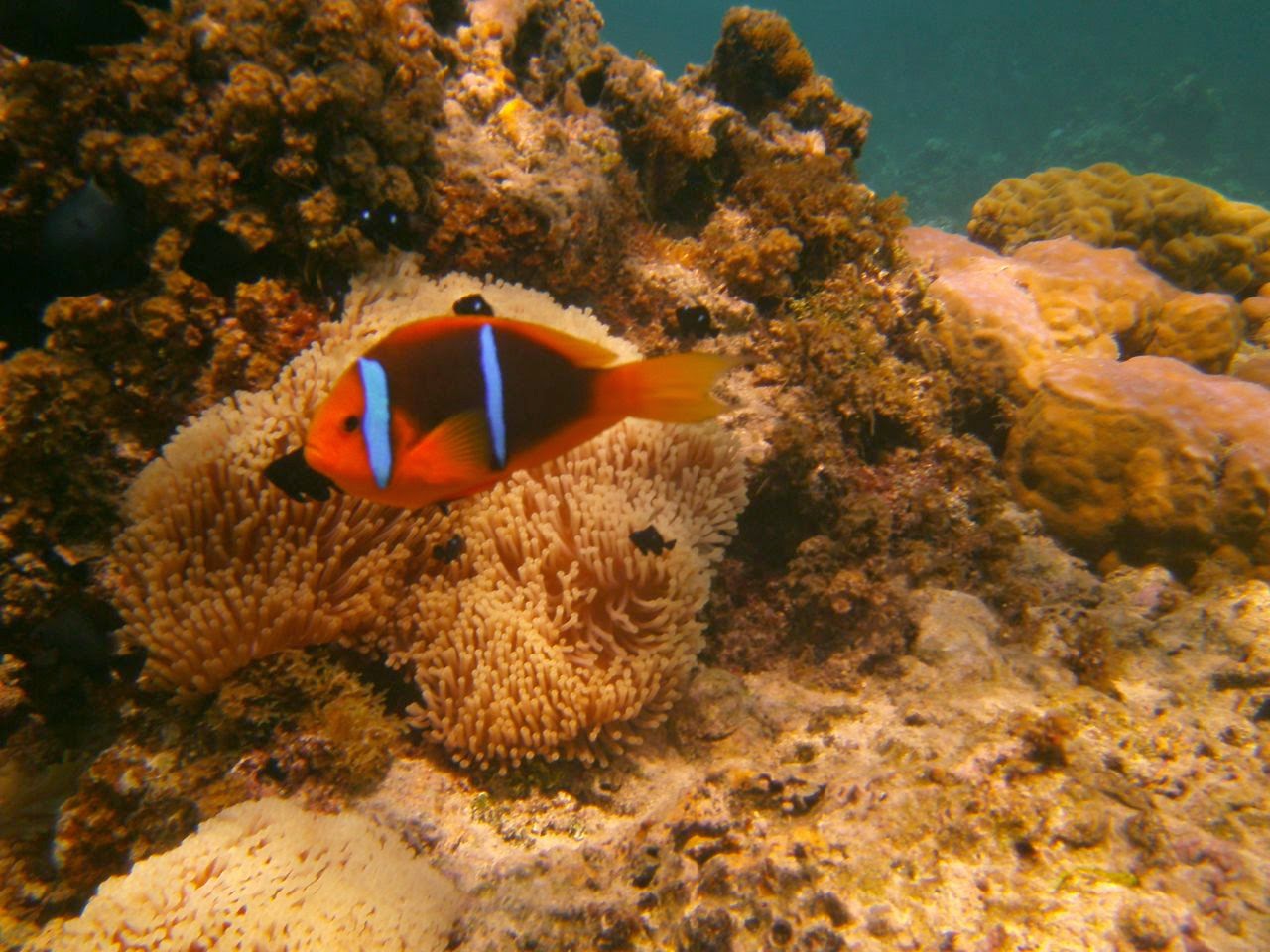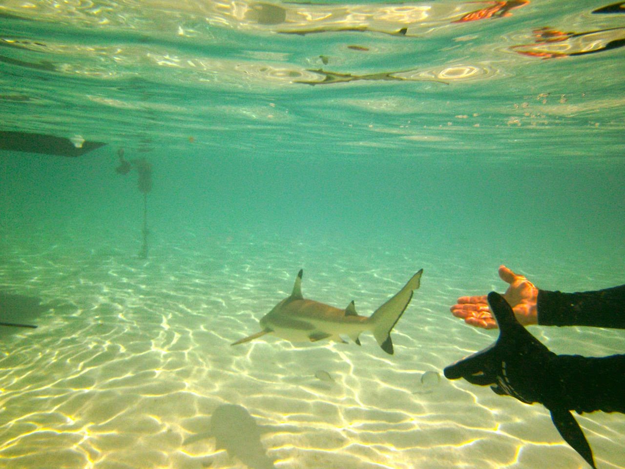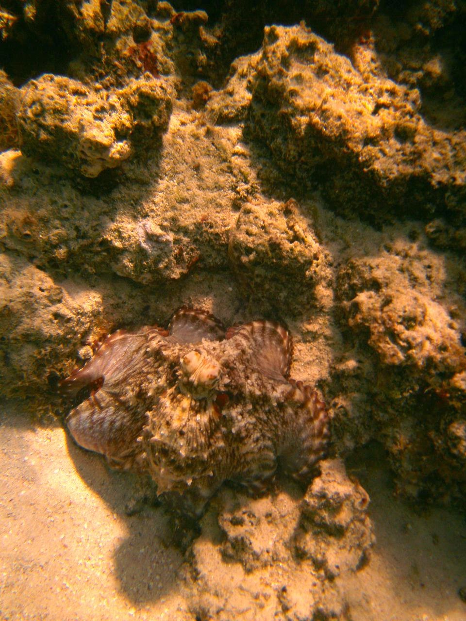 We came across a few beautiful “Feos,” scoured the reef for Ma’oas (sea snails,) surprised a few red-and-green octopus who fleeted between our feet, and did more cast-fishing from the reef ledge, tossing more fish back! At last, we found a few “bommies” (large coral columns) worth exploring: excellent variety of coral, teeming with multicolor lagoon fish, and surprised 2 very large nurse sharks that were basking in a quiet, super-warm, sandy pool. The trip was marred only by the sight of a rudder and its post resting on the “bommie,” reminder that we need to remain ever vigilant when navigating the lagoons.