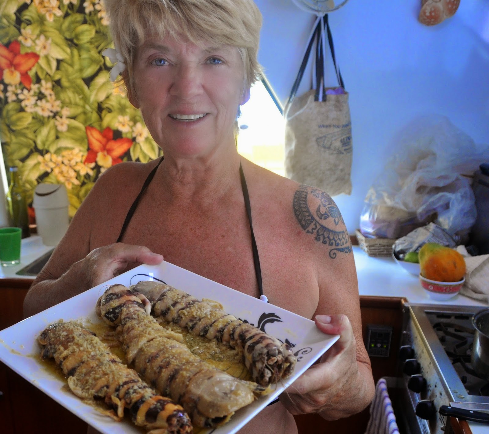 The trip from Tahanea to Fakarava landed us a 25 lb wahoo that William expertly cleaned, skinned, vacuum-packed and froze, not without a sashimi degustation; our favorite? Just a dash of salt and a few drops of olive oil, marinated 30 minutes, served cold, lime optional. Yum!