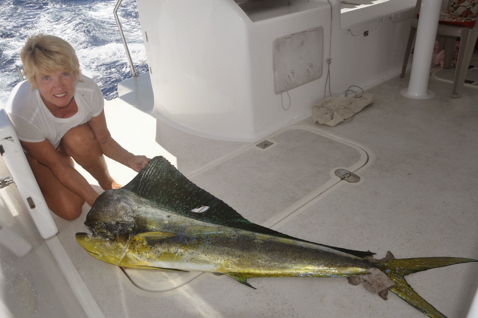 Fishing is oh-so-good! Take this 35-lb Mahi Mahi caught between Faaite and Tahanea. The head itself, yummy-grilled on the BBQ, fed us 2 full dinners.