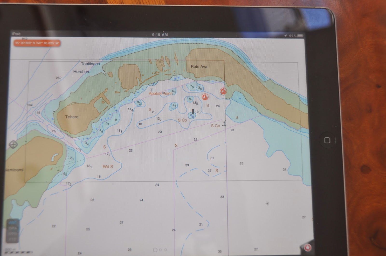 1) AVATORU – The shallower of the 2 passes, we were told can be dangerous. We took it to exit the lagoon at slack water and it was flat. Since the lagoon side is relatively shallow, we favored the S.E. side of the pass where the water is deeper. Once inside the pass, we found deep water and no problem.
