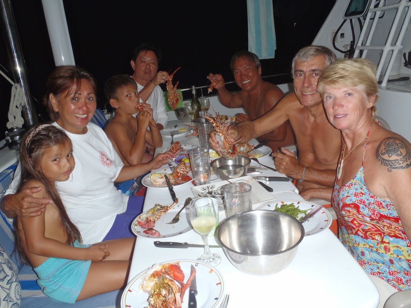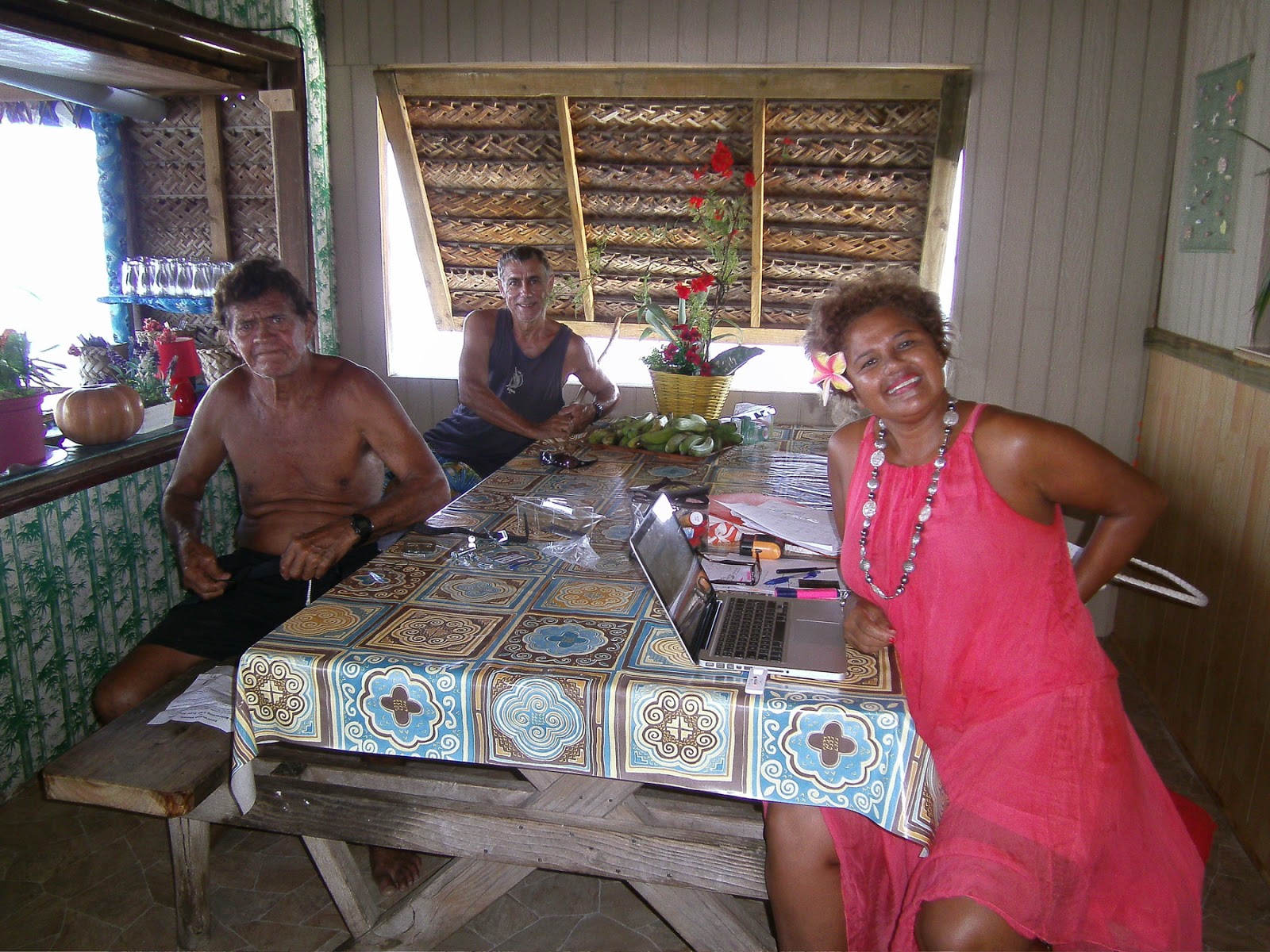 With light winds from NE, we opted to stay at the Kia Ora anchorage close to the pass, in spite of the rolling motion created by the incoming surf from the pass. The anchorage is close to town where we got fresh bread every morning from Mamie Jeanine. When the Aranui came town, coming from the Marquesas, we waited for its “baleinieres: do dock and vied with the locals to raid pamplemousses and bananas; when the red hull of the Maris Stella was at the dock, a quiet visit to the captain netted us some fresh produce straight from Papeete; and when Williams showed up, it was with 10 kg of live Pacific lobster he had arranged to get from a friend of his on the atoll. We were set for a cool holiday!