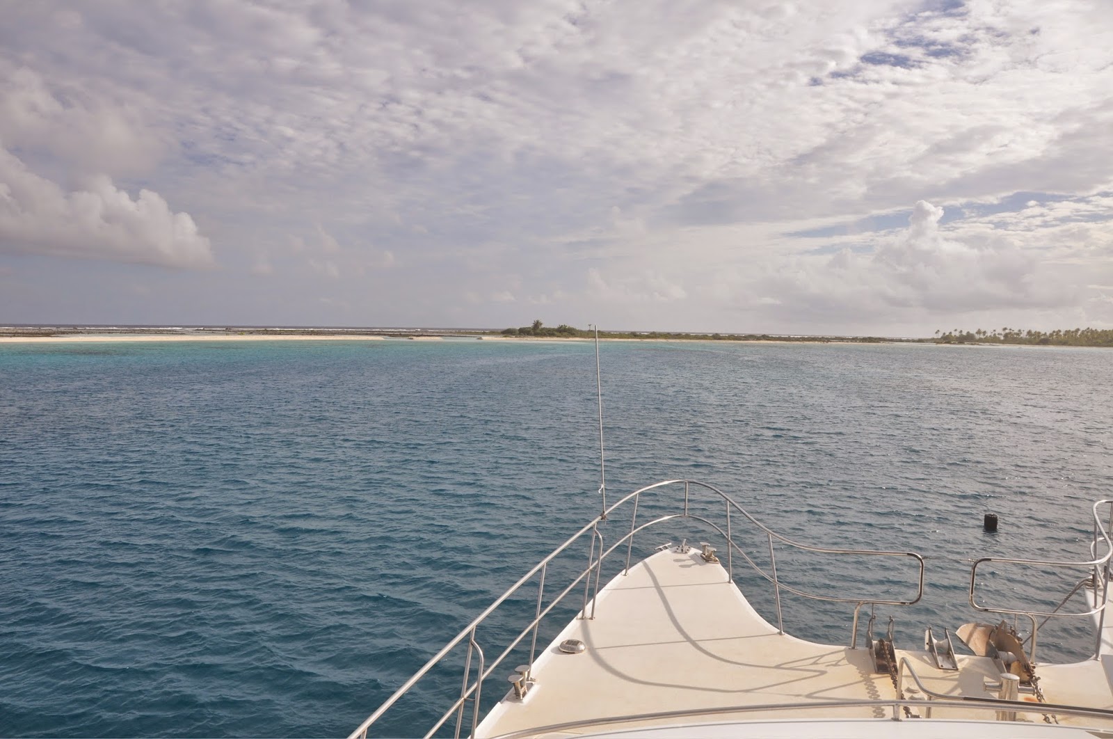 The calm weather was holding, motivating us to explore a bit more to the west of the atoll, to a spot called the “Lagon Bleu.” JP carefully scanned the bottom with our fish finder and found a spot where the coral heads were spaced out just enough for us to drop anchor. It’s not recommended to overnight at the Blue lagoon, since the dominant East wind will whip up quite a chop at this western end of the lagoon. But no wind was expected for the next 24 hours, so we kept BigD on a short leash with only 1 fender on suspension.