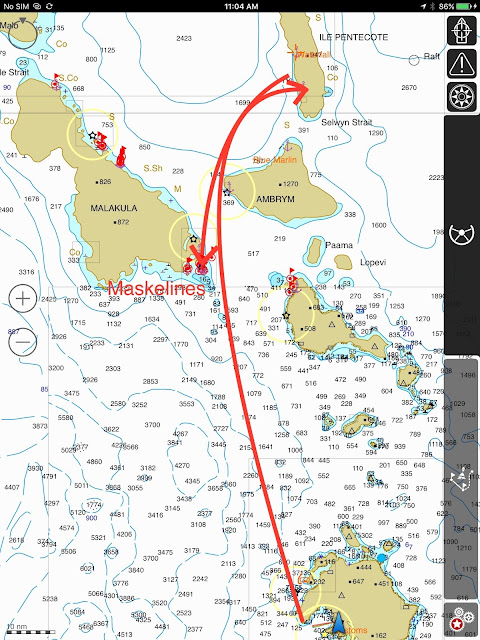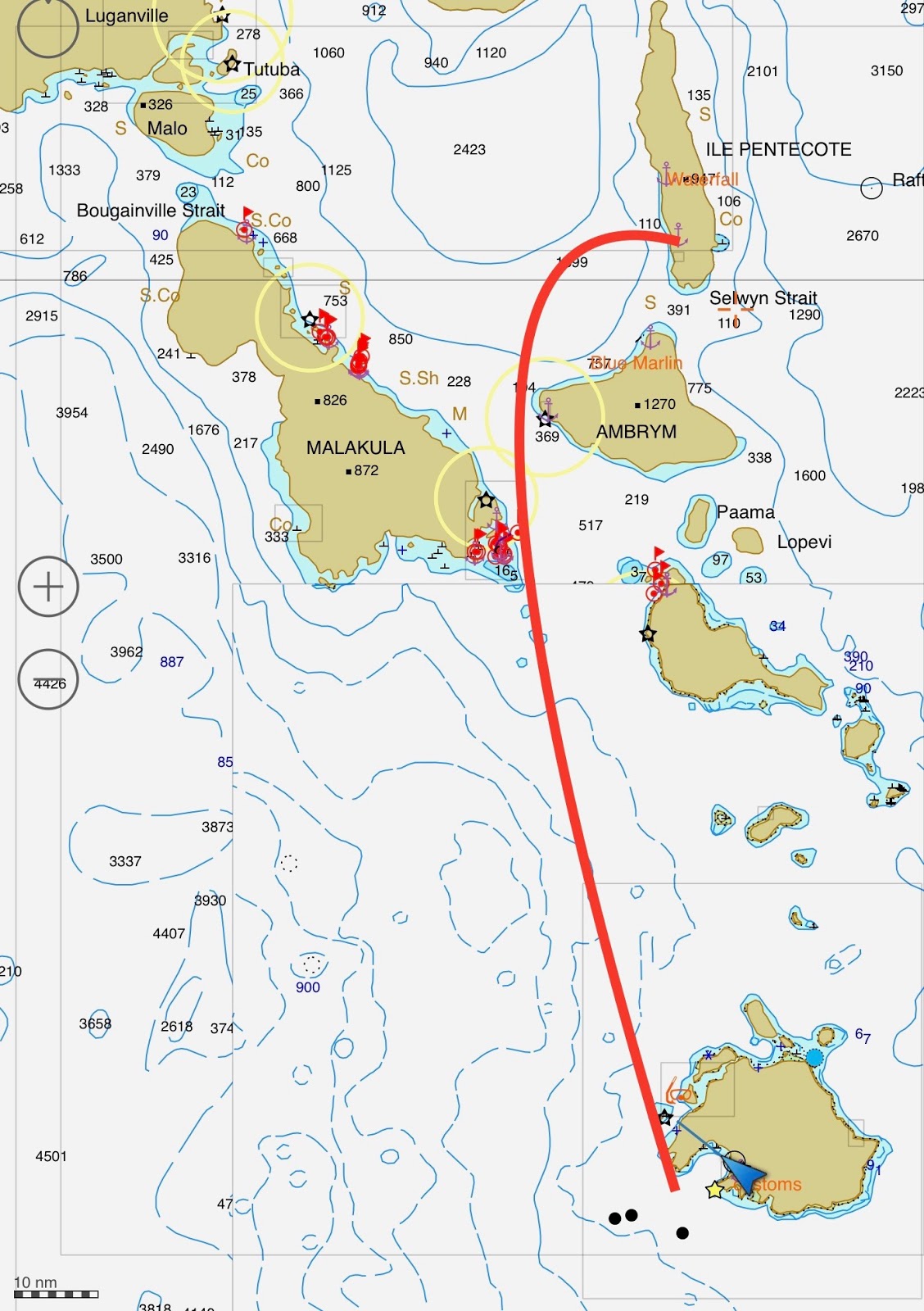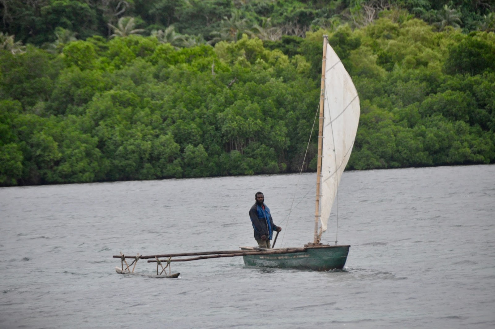 I lost it. After 2 hours of heated argument, with Stewart trying to swallow his mistake under the blows of Chief Mad Dog’s insults, while I responded with not-so-ladylike language to the threats of impounding our dinghy and our powercat, JP managed to calmly bring the fine down to 1,500 Vatus ($15) which we paid quite reluctantly. Chief Mad Dog returned to his village with money in his pocket and my evil eye following him… something was fishy. We left at dawn.