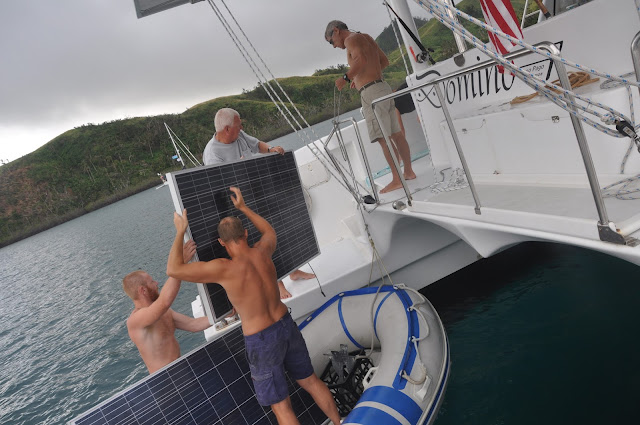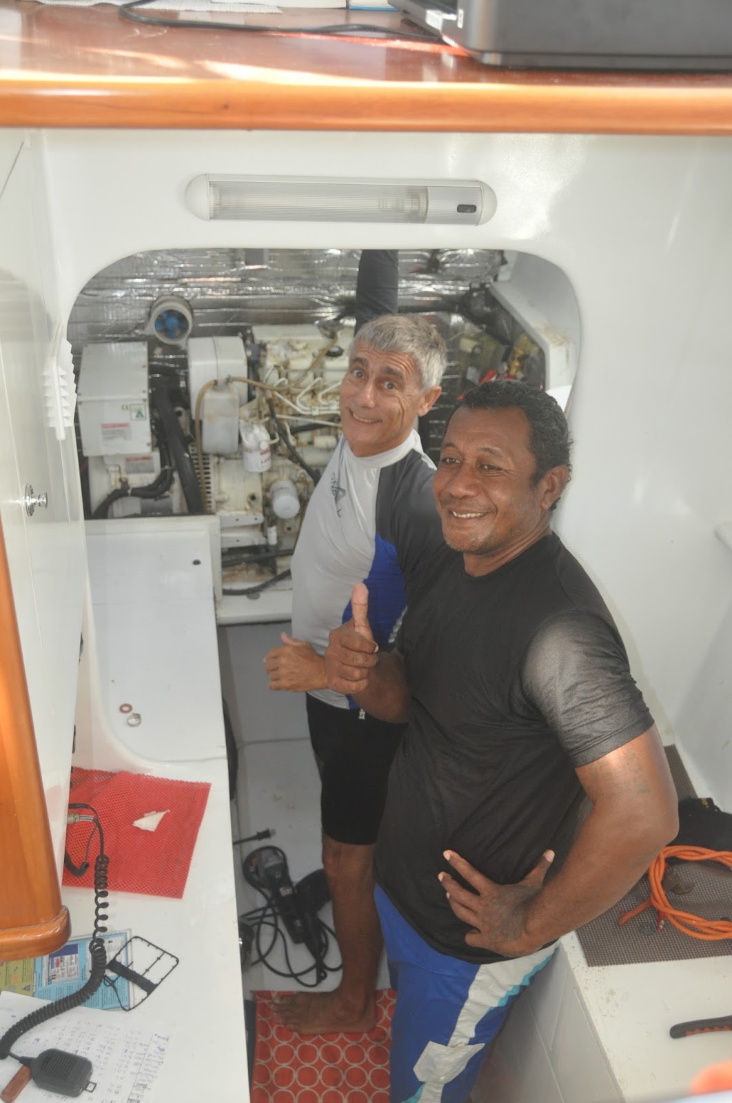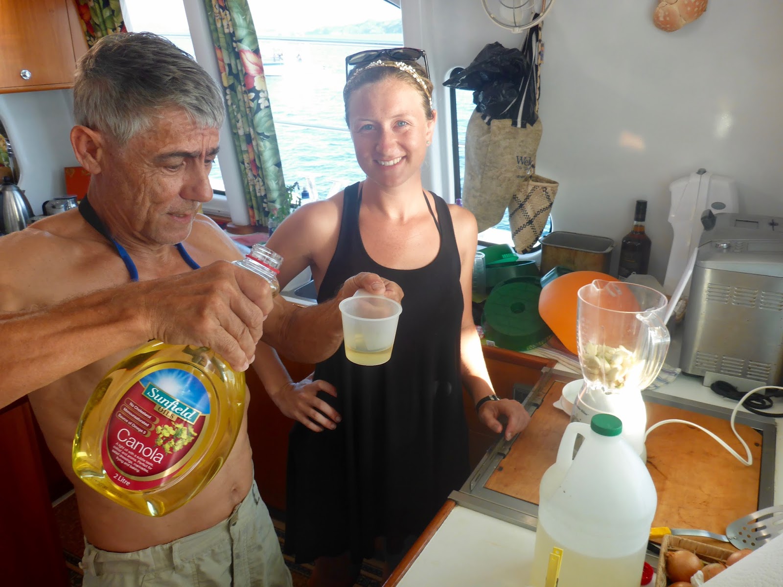 On board DOMINO, JP and Tessa (S/V REWA) prepare a batch of chili-garlic spray, Recipes sent by our son James via Iridium communication… pretty cool! |