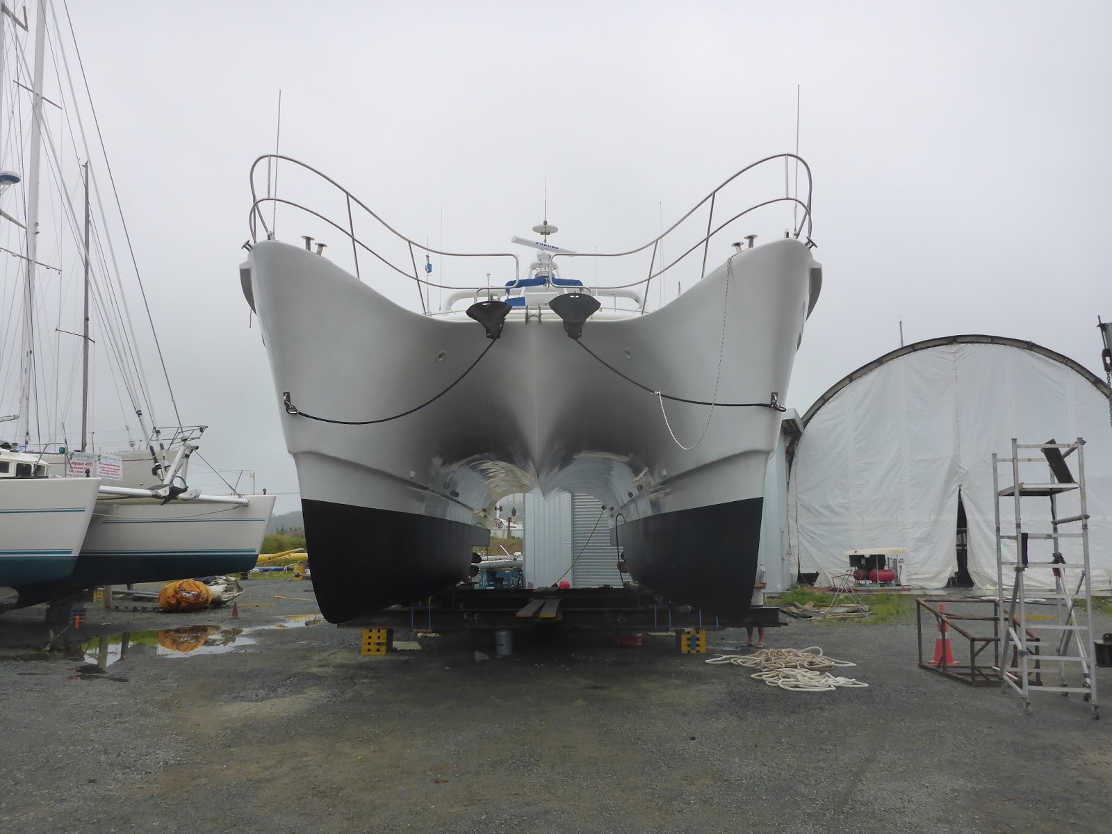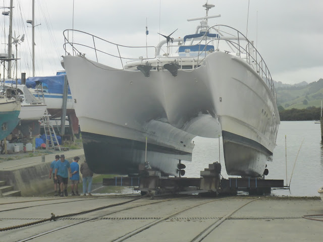 Feb. 26 – Cavalli Islands to Whangaroa – or WOWangaroa… no sooner had we passed the head of Whangaroa bay entrance we were in a green paradise, with volcanic lava domes peaking out of green forests. We found calm anchorages at last, dozens of nooks and crannies to recuperate our balance. There again, we caught up with friends, the Tennant Powercat “November Rain.” Garry and partner Lori had just won 3rd place at the national Penn fishing tournament, 1stplace at the local gamefishing club, and Gary was keen on giving us all tips on fishing… oh, and how to get to good anchorages, how to safely cross the bar in Hokianga, and how to best navigate “over the top.” In the end, we both fueled up and Garry and his shipmates escorted us all the way to North Cape.