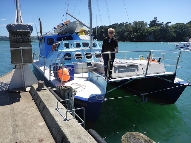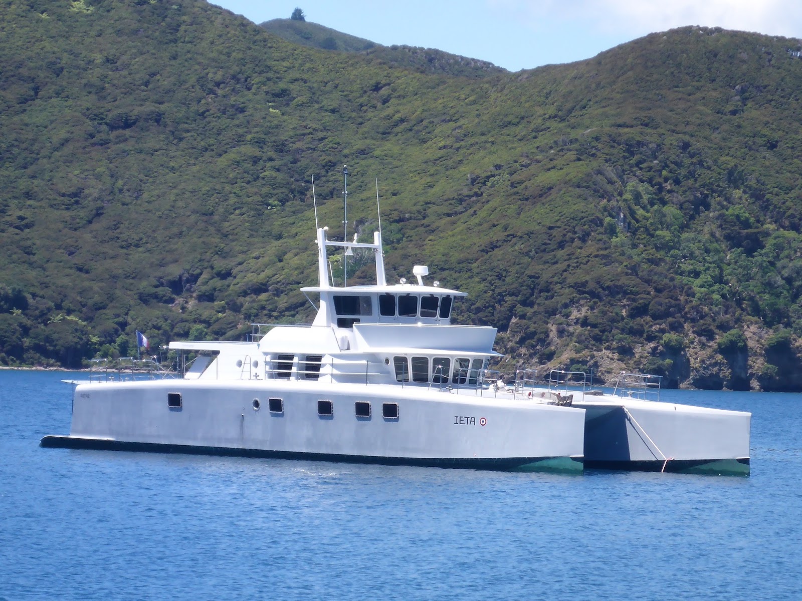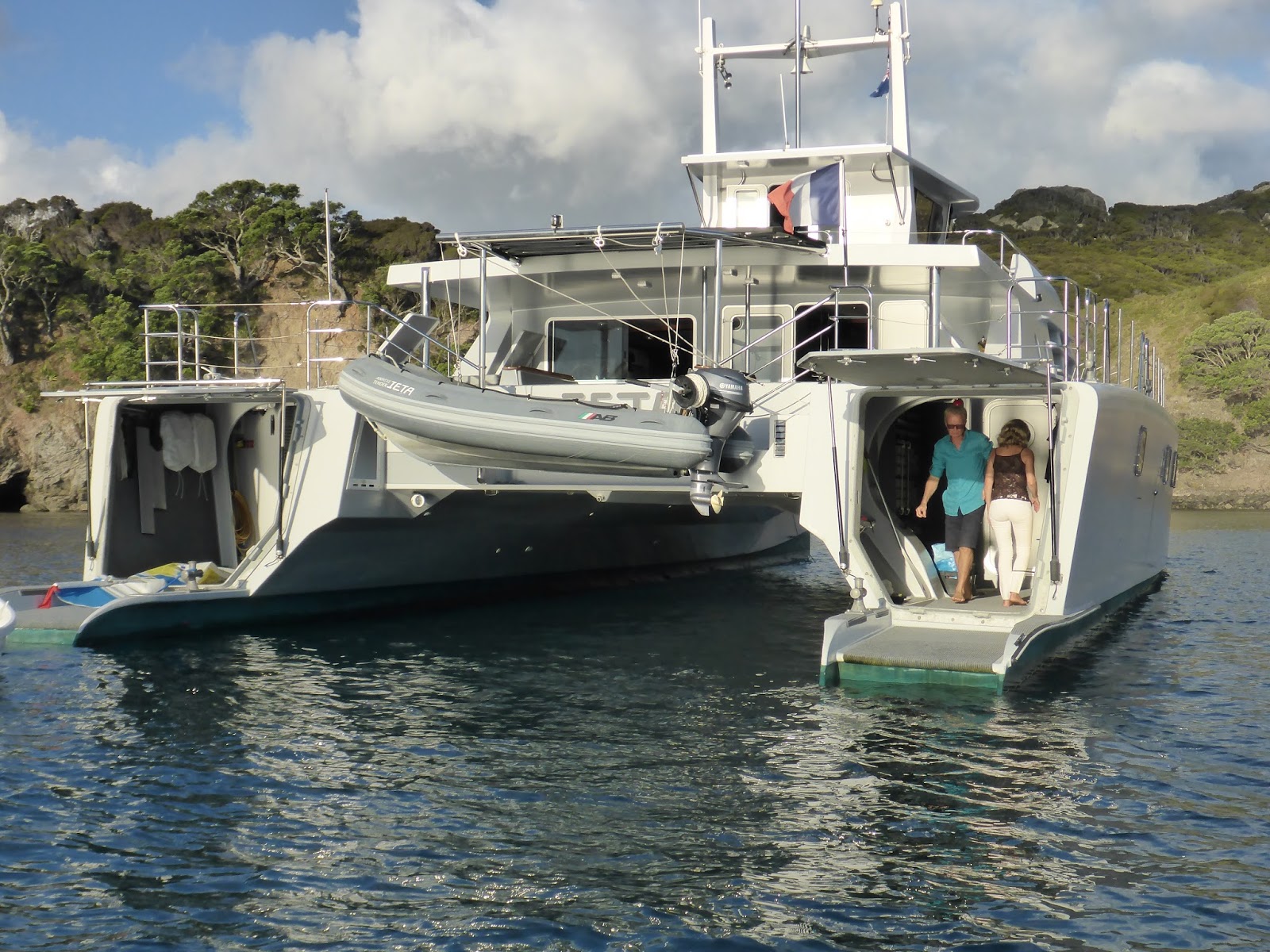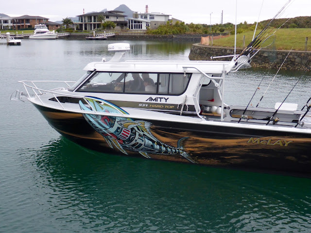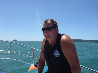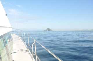 We rose early, having a 2 to 3 hour ride, depending on weather. We expected 25 knots of wind and rough seas… we got ZERO knots and flat seas… is the forecast ever right in NZ??? Pete called us on our cell phone, directed us to were he wanted us to cross, and just guided us in as we glided on a mirror!