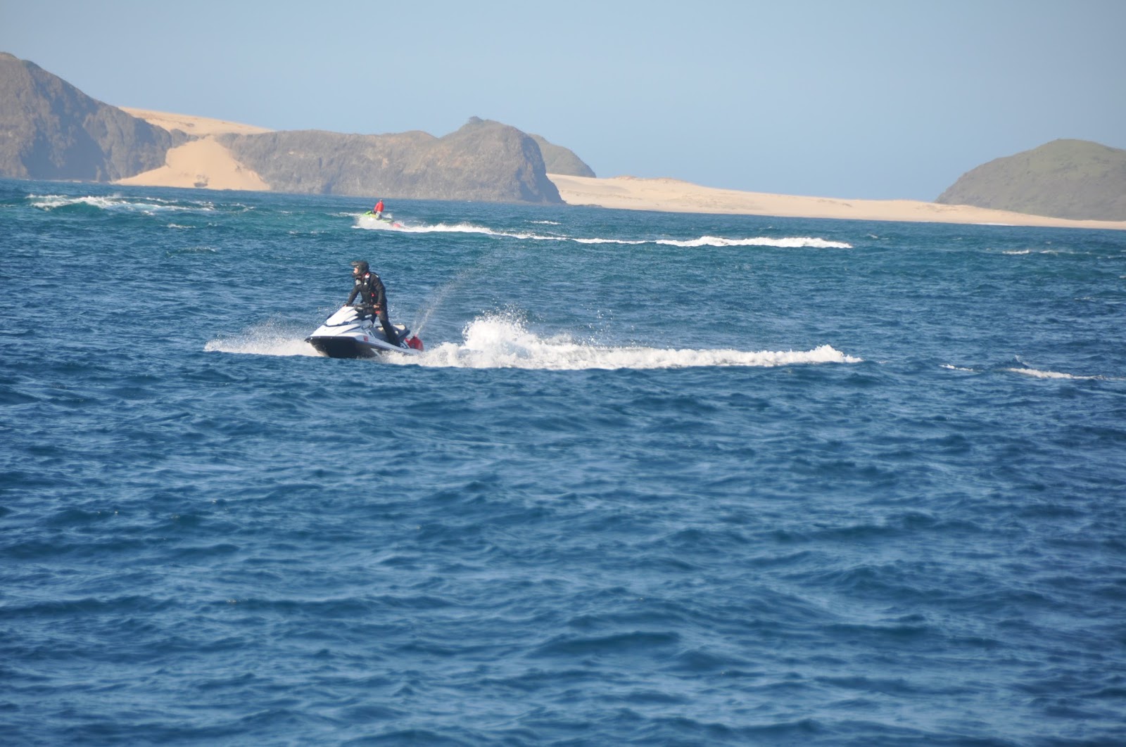 Not long, as it turned out. By noon, we were sighting the first group at Cape KariKari, and the wind freshened up, soon to reach 20 knots, and a nasty chop was kicking the riders sideways.