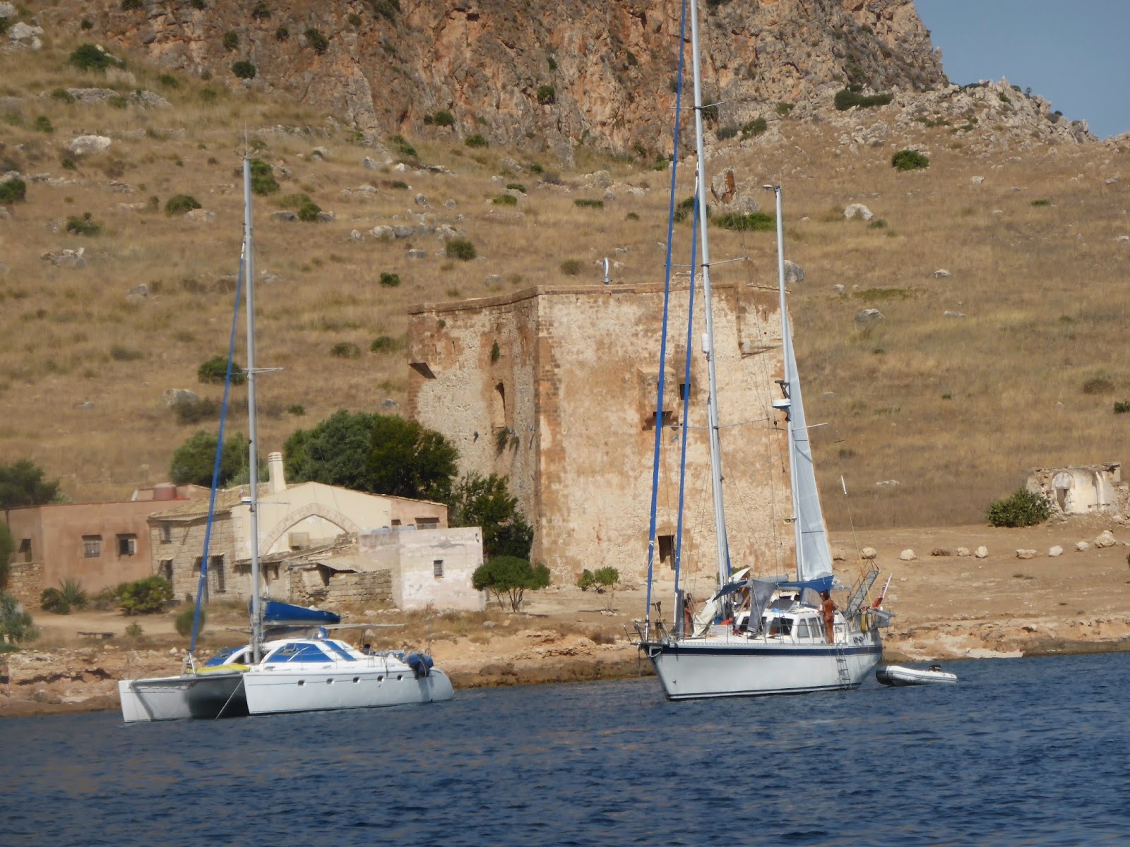 Before sunrise next day we headed across the Gulfo di Squillace, so named as it’s notorious for sudden squalls, but we had perfect calm conditions. We had planned to overnight at a marina called Le Castella, but when we got there at 1600 hours we found it very small, shallow and with no assistance or direction available.