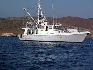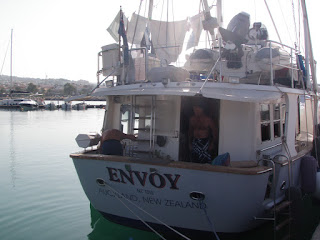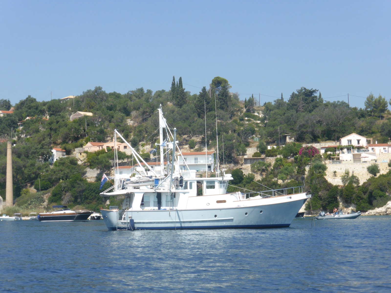 Envoy cruising in Greece. The starboard stabiliser pole has been deployed to set a flopper stopper when anchoring. Hydraulic stabilisers provide excellent stability under way