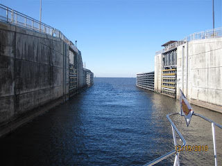 Thursday, we moved on. The weather was warming and Mark was able to drive from the flybridge. This day we had about 43 miles to go with two locks, three bridges and manatee zones. We passed through the citrus areas of Florida with orange trees lining the canal.