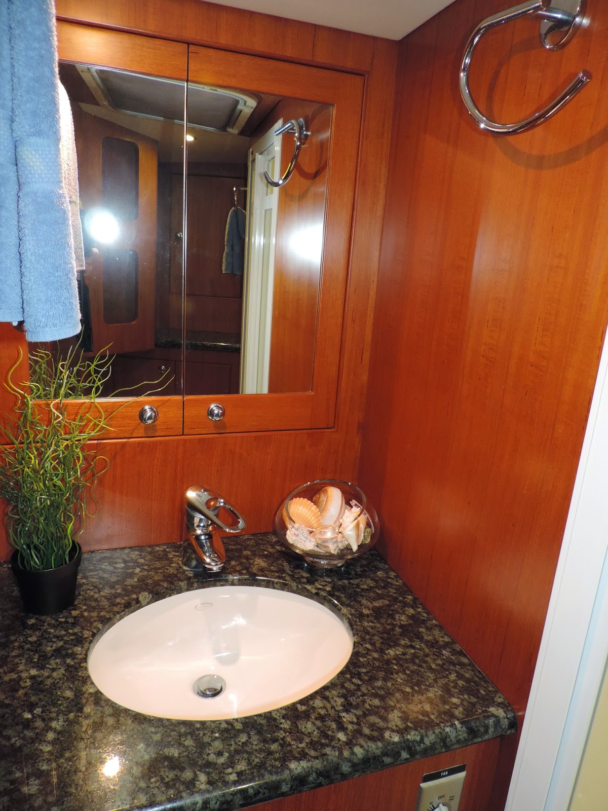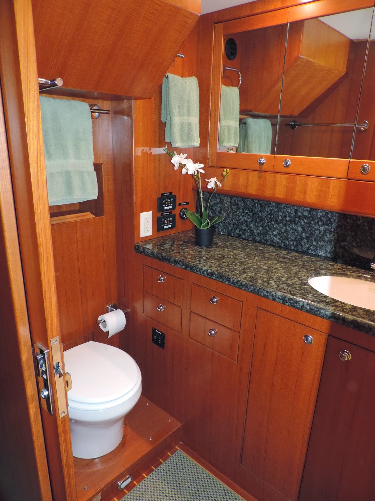 To starboard is the large master Head and separate shower stall. There are two Tank Watches in the Head-one for grey water and one for holding tank- and a water tank level meter.