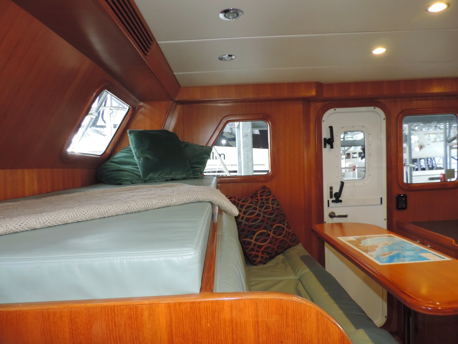 The interior is teak through out with teak and spruce sole. The custom non-skid area rugs through out were replaced in May 2014. The upholstery in the salon and pilothouse was upgraded to ‘ultraleather ‘ (color eucalyptus) and all counters in the galley and heads are granite. All windows and doors have screening. Most of the interior lights have been replaced with LEDs. Extra railings have been installed on the stairways and overhead in the salon and pilothouse for safety. Both staterooms have custom mattresses and Dometic fresh water flush electric heads.
