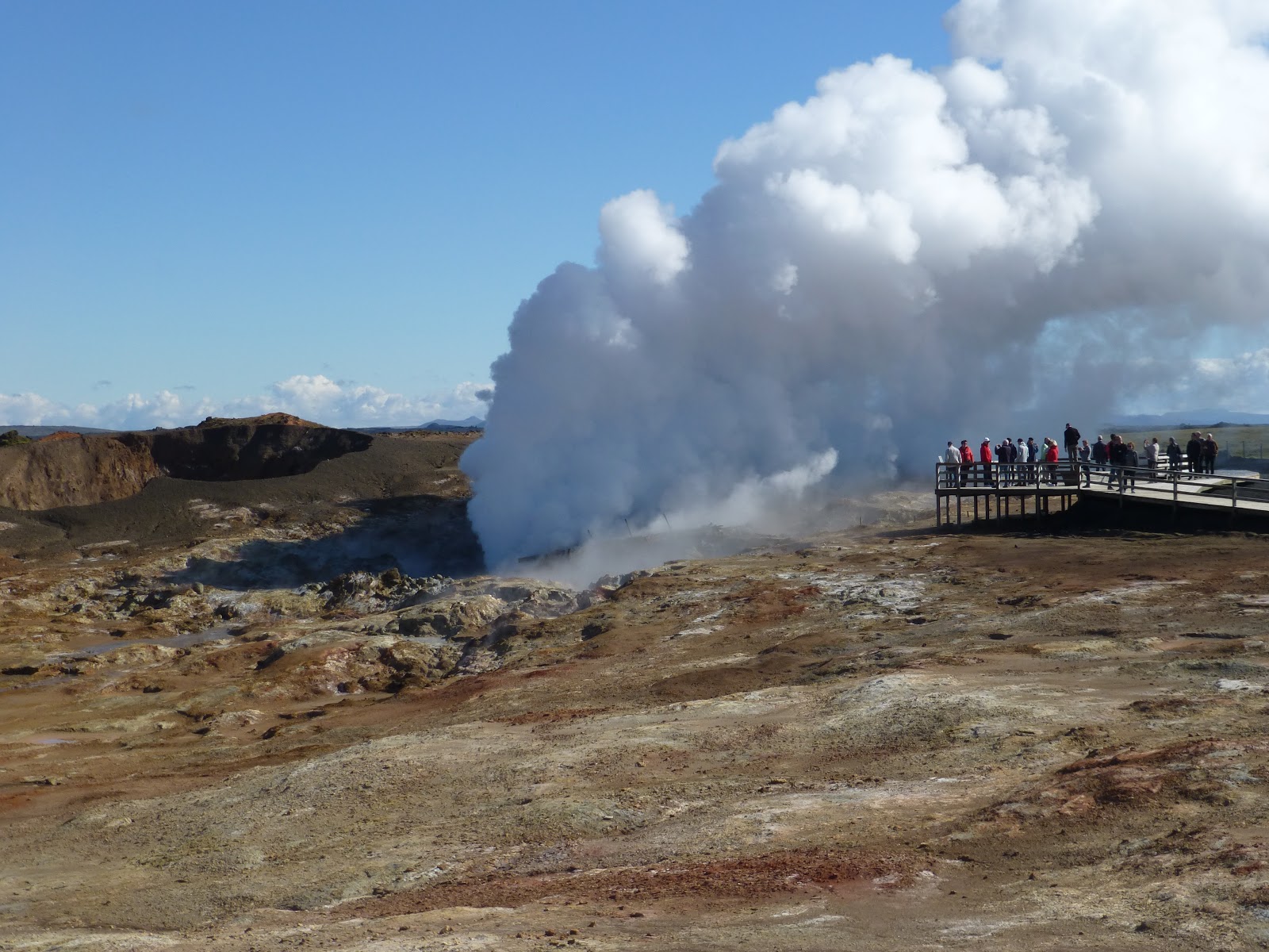 The day began with a buffet breakfast in the hotel and then we met our tour guide for the morning. After visiting the spectacular Lutheran Church with the 73 meter spire, we drove through a number of small communities and fishing villages on our way to the Rekjanes Peninsula. The main attractions were lava fields, geysers, scenic volcanic shorelines and another version of the “crack in the earth”. Some of the areas were Unesco world heritage sites. In the afternoon we had a three hour stop at the “Blue Lagoon”, which is hard to describe in words. The facility is well run, modern and the water is a milky blue from the silica and other chemicals. The temperature is even, ranging from 37-39 degrees Celsius as one moves around the lagoon. There were hundreds of people, but it still did not seem particularly crowded. The sunny skies were a welcome change. We tried the facial masks, both silica and algae, had a drink at the walk up bar, took videos and generally relaxed. After 90 minutes in the water, we showered and had a quick lunch at “Lava”, with complimentary sparkling wine and then back to the hotel.