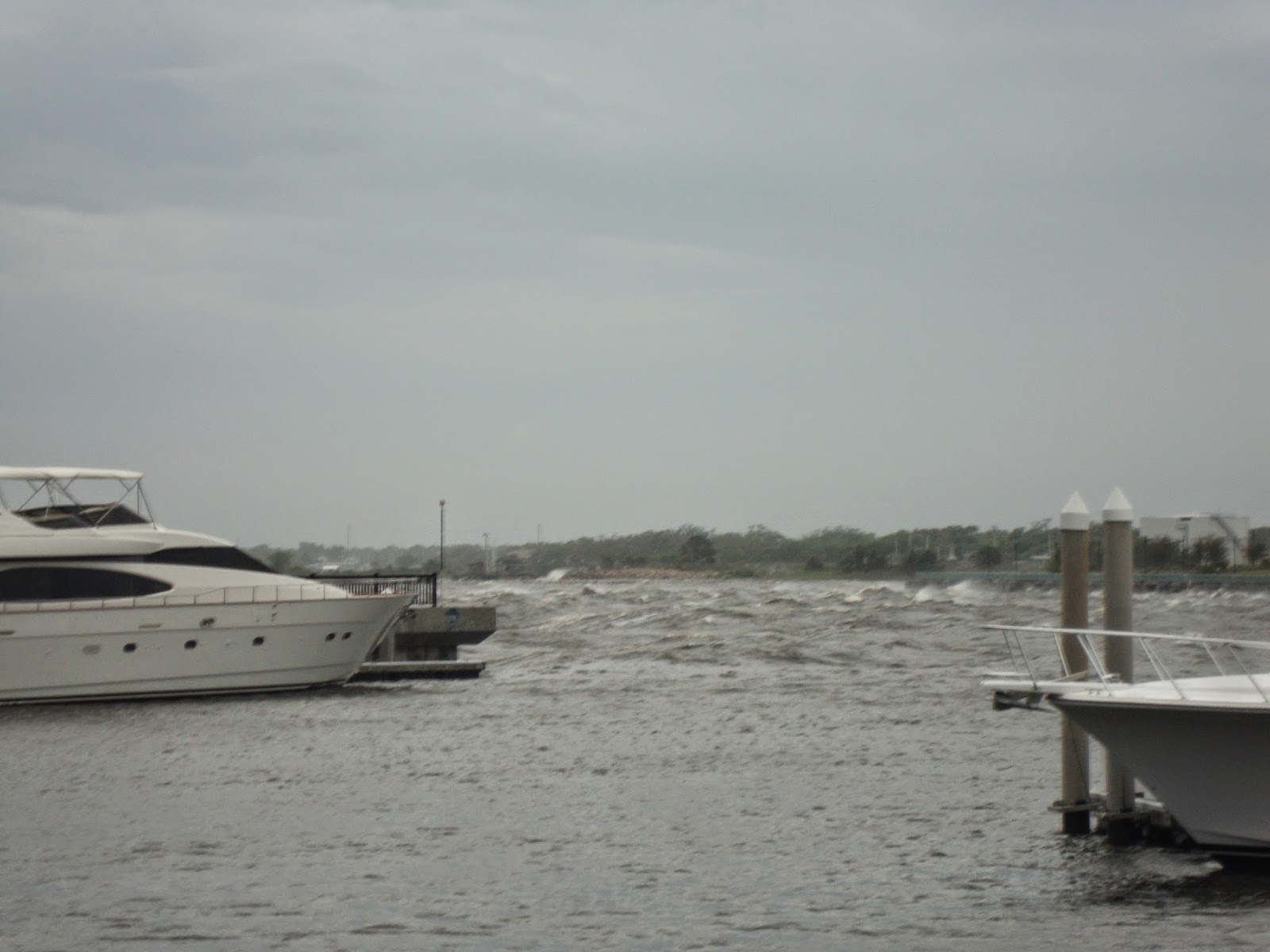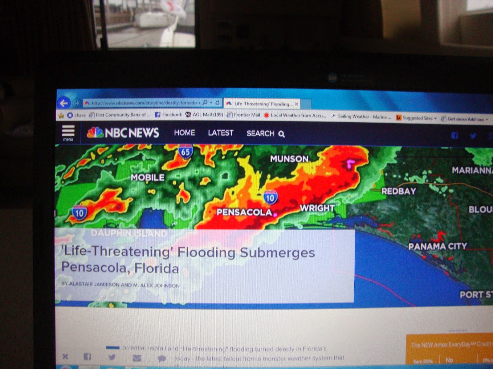 Monday was primarily windy with a few showers late in the day. After midnight all hell broke loose. High winds, Non-stop rain, and endless lightning. At times being on Tourist was like being a contestant in a rodeo. The severe weather lasted all Tuesday and into Wednesday morning. In all they reported over 2 feet of rain had fallen causing flash flooding all over the area. 5″ fell between 9 and 10 pm Tuesday alone. Supposedly this was more rainfall than in all of hurricane Ivan. Over 44,000 lightning strikes were recorded in one hour on Tuesday. And we lost power at the marina for nearly 20 hours. Unfortunately one woman lost her life due to the flooding.