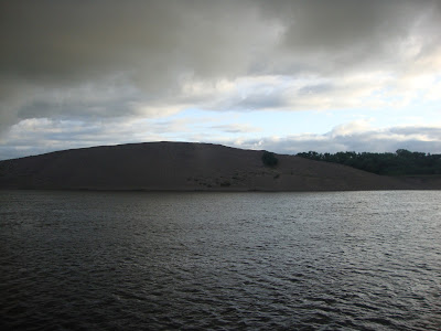 The bottom is mostly sand in this area which is loaded into the barge and taken a few miles downstream where it is scooped out and deposited on an island and spread out by an earth moving machine. The eventual end result is a nice sand dune for the public to use.
