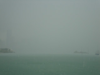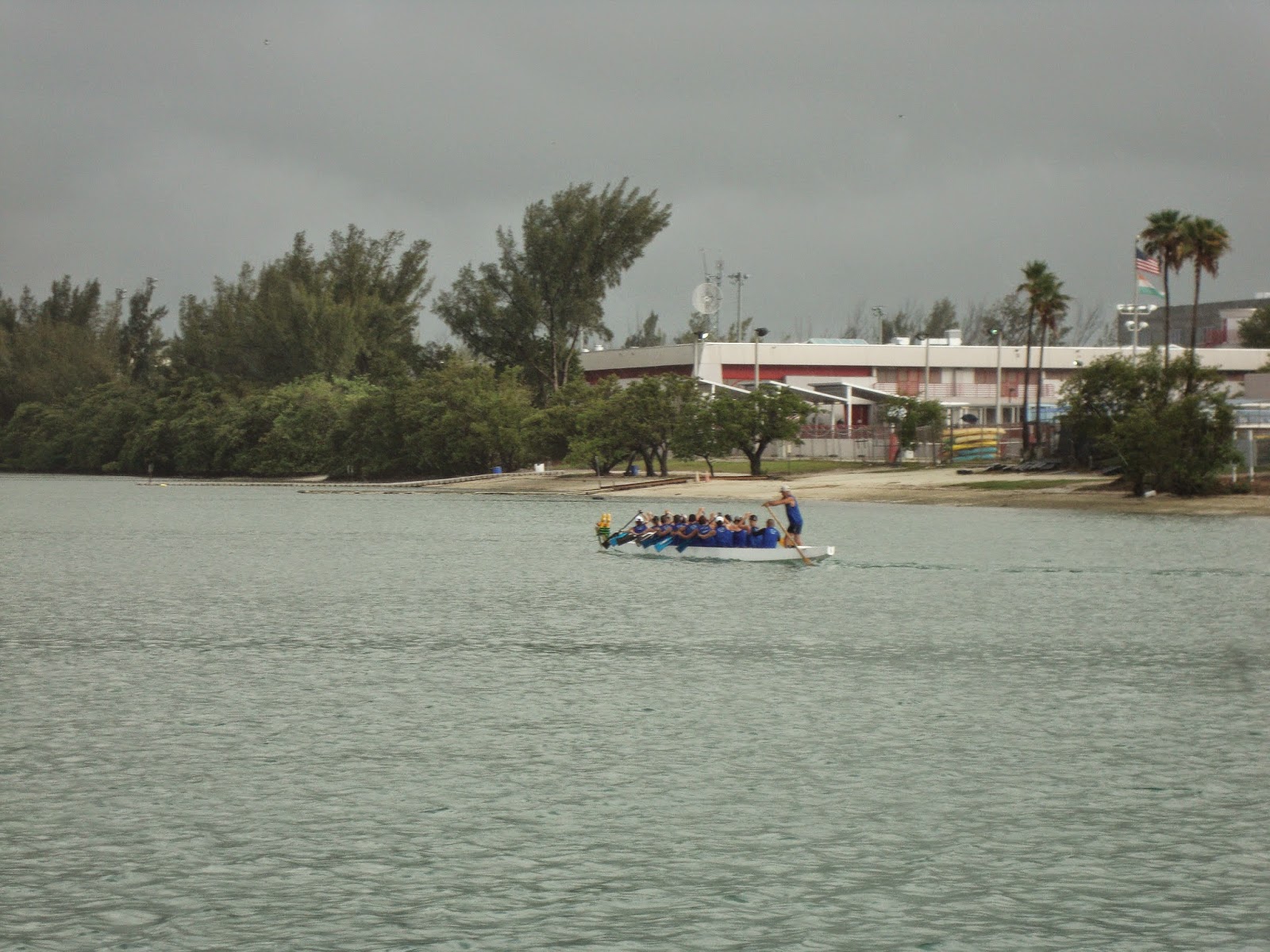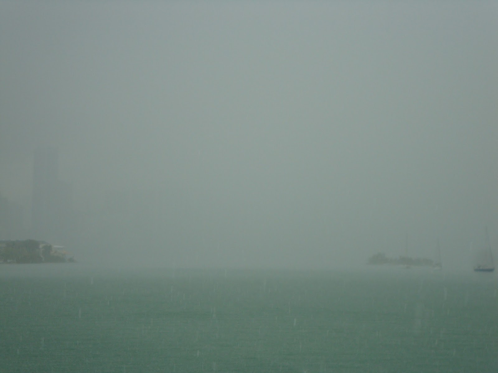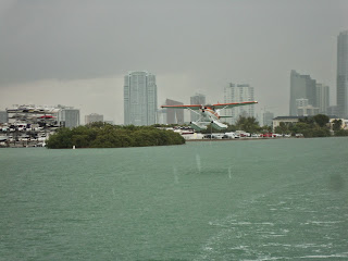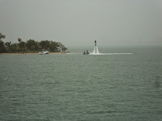 In the short distance from No Name to Marine Stadium it rained then quit then rained as we were dropping the anchor. During the dry spell we saw a guy with a rocket pack on his back shoot up out of the water. And we nearly got run over by a seaplane taking off.