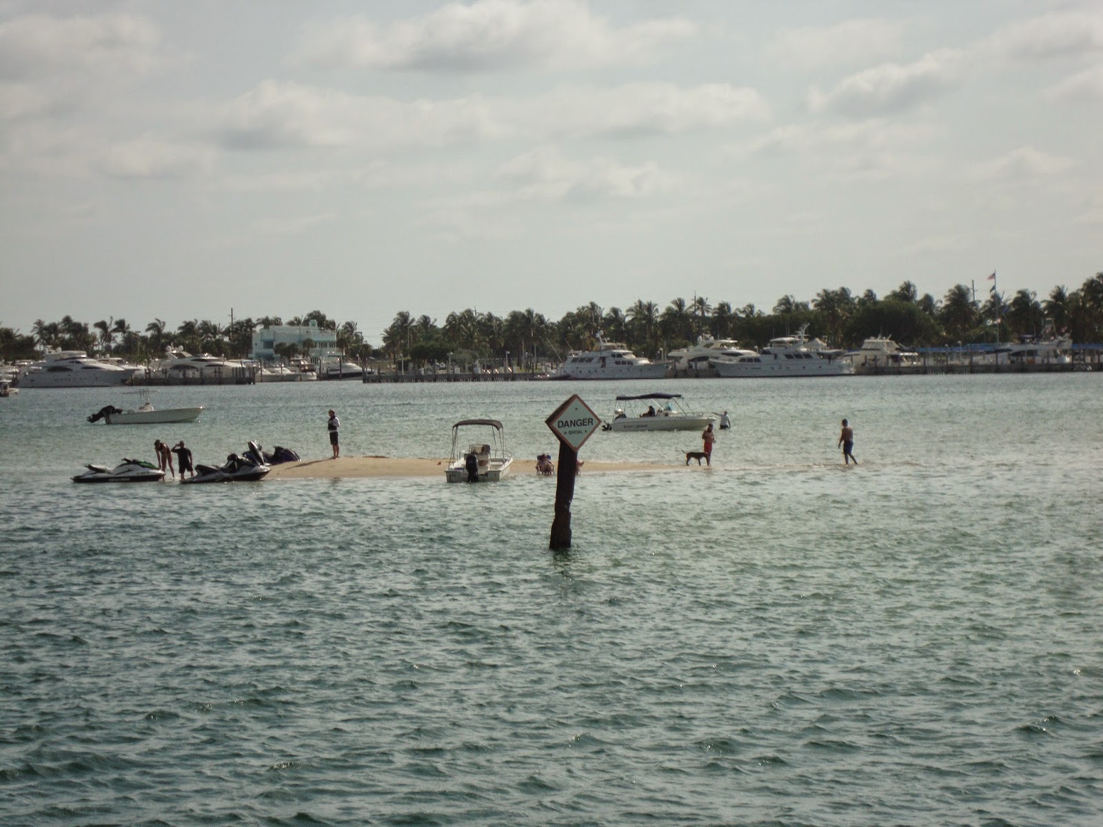 A low tide sandbar attracts the beach goers just inside the Haulover Inlet.