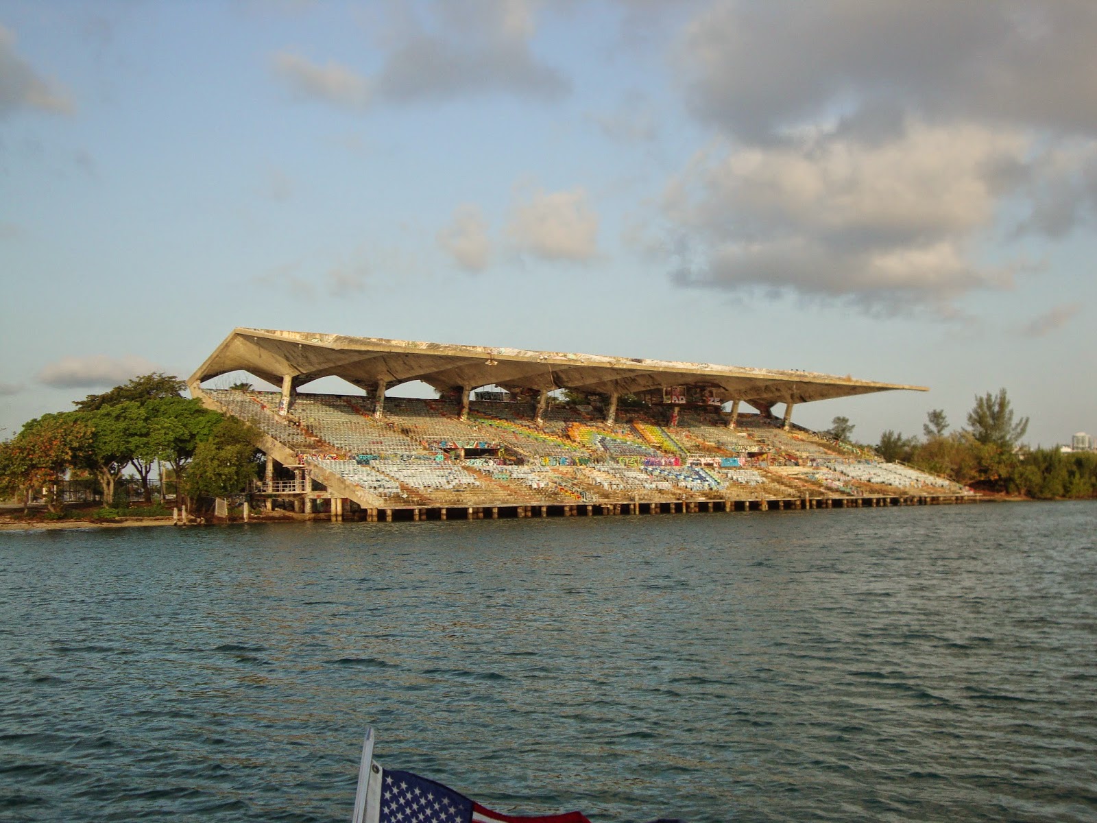 Plenty of water and a nice protected basin but once we were inside I didn’t feel that there was enough room for Tourist to do her normal anchor dance of swinging from side to side without clobbering another boat. So out we went and on to Plan B. Marine Stadium, right across from downtown Miami.