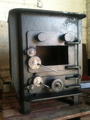The project waited patiently through the spring and summer while we found some work but with the arrival of autumn and the by now traditional sewing of selves into thermal underwear I tackled the project again. Did the geared mechanisms with help from local machinists who turned up the mounting bosses, ran into trouble welding the handles onto the cogs but discovered that cast iron welding rods did the trick. Ordered some stove glass and hefty firebricks and then made up a tee for the flue out of 150mm heavy wall pipe and hoisted the new stove onto a trolley, and towed it outside with the truck for testing. I attached a short length of flue and lit the stove. The resulting spectacle drew a bit of a crowd so consequently I got fuck all done the rest of the morning but everyone seemed to like it.